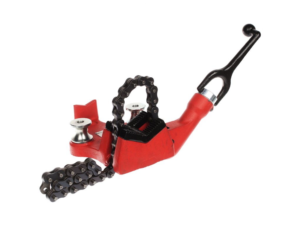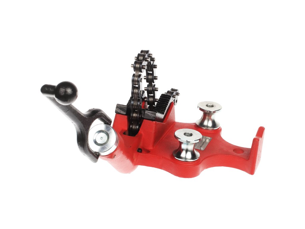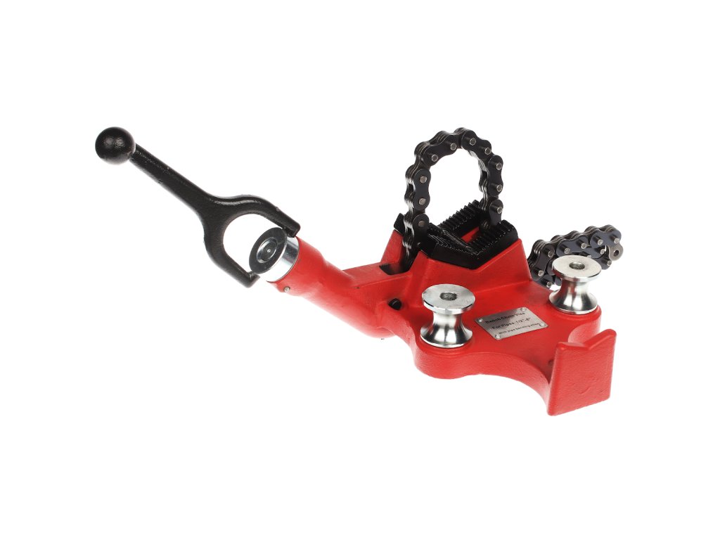 Robuster Schraubstock zur Befestigung von Röhren mit Durchmesser 12 – 150 mm (1/2" – 6") mittels Kette bei Gewindeschneiden, Biegen usw. Gusseisensockel, Stützfuß, Backen aus gehärtetem Stahl, Kettennachspannung mit Kurbel, Loch zur Befestigung an der Arbeitsplatte.