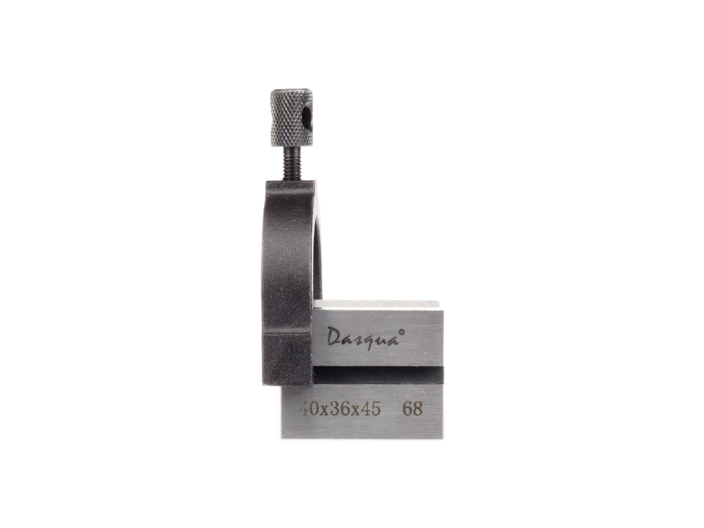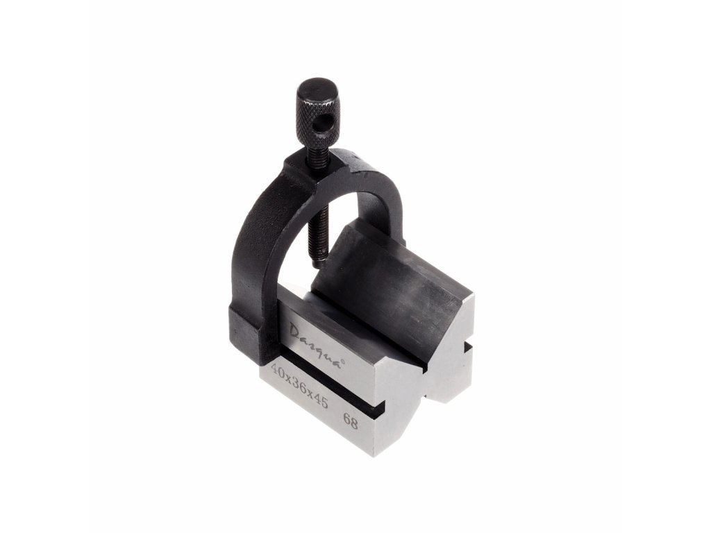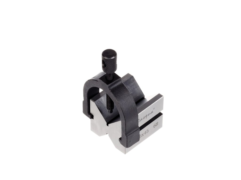 Präzisions-V-Block mit Klemmsätteln, geschliffener Kontaktfläche, Ebenheit und Parallelität ±0,01 mm. Hergestellt aus gehärtetem Stahl. 90° Nutwinkel, Abmessungen 36 × 40 × 45 mm, Klemmdurchmesser bis 30 mm. Paarweise geliefert