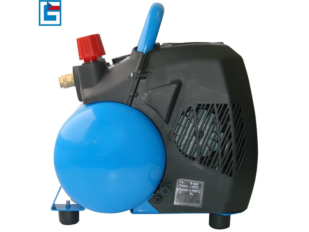 Tragbarer, ölfreier Kompressor, bestimmt für Servicearbeiten (→ Schmutz von Computern/Elektroleitungen wegblasen usw.) oder für den Heimgebrauch (→ Bälle/Reifen füllen, Heften, Airbrushen usw.).