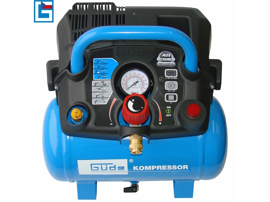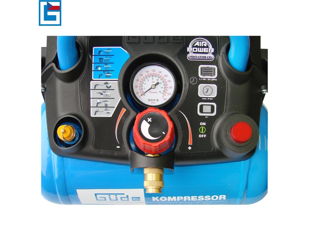 Ausstattung: Manometer (→ Messung des Arbeitsdrucks), 1 Druckluftausgang (→ Metall-Schnellkupplung), Druckschalter, Sicherheitsüberdruckventil, Staufach, Transportgriff.