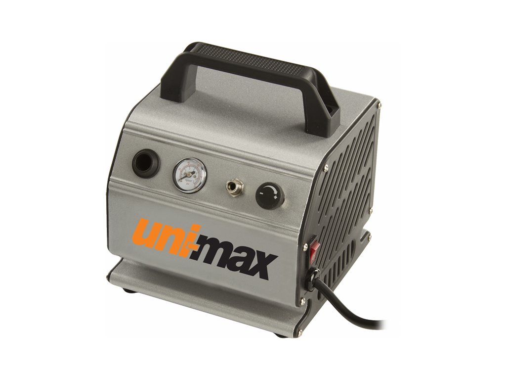 Airbrush-Minikompressor mit einer Leistung von 20 l/min, Einschaltdruck 2,1 bar, Abschaltdruck 3,1 bar, Behältervolumen 0,3 l, Spannungsversorgung 230 V/50 Hz, Ausgangsverschraubung 1/8“, Länge des Zuführungskabels 1,9 m. Verwendbar für Düsendurchmesser von 0,2– 1 mm.