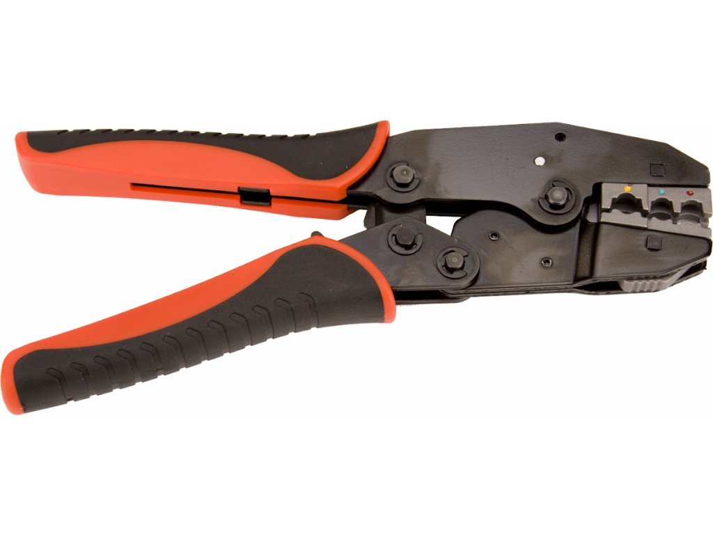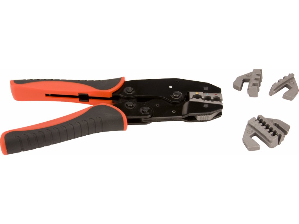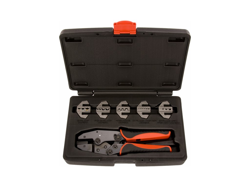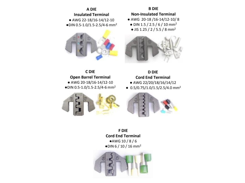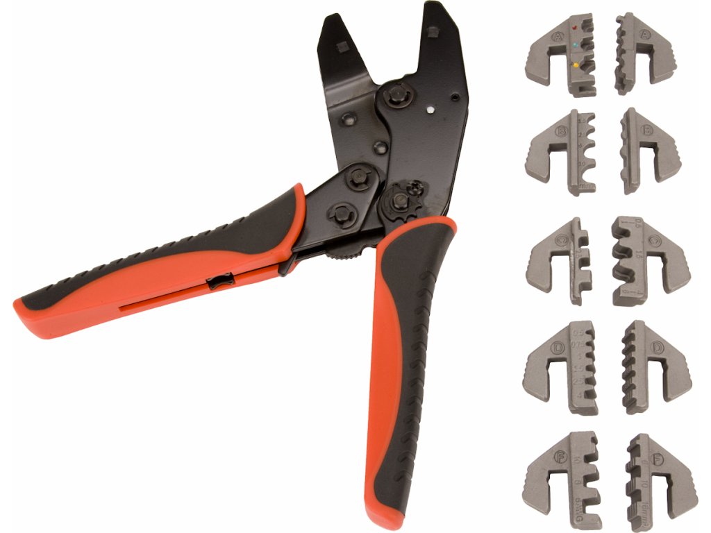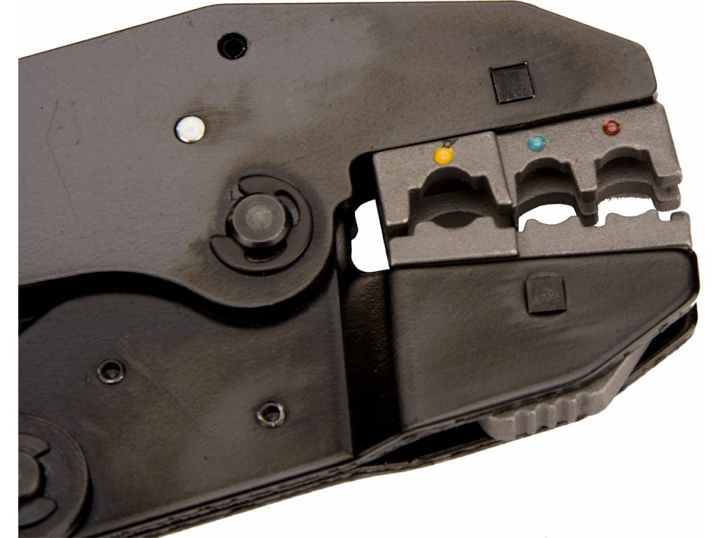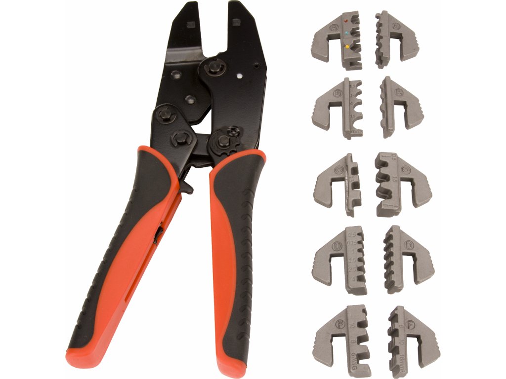 Krimpzange mit wechselbaren Backen zum Fixieren verschiedener Kabelklemmentypen (mit und ohne Isolation). Schnell wechselbare hochwertige Backen (5 Paare) der Typen A, B, C, D, F sind durch präzises Gießen aus Material AISI 4140 und vergütet auf HRC 38 – 45. Oberflächenbehandlung durch Phosphatieren.