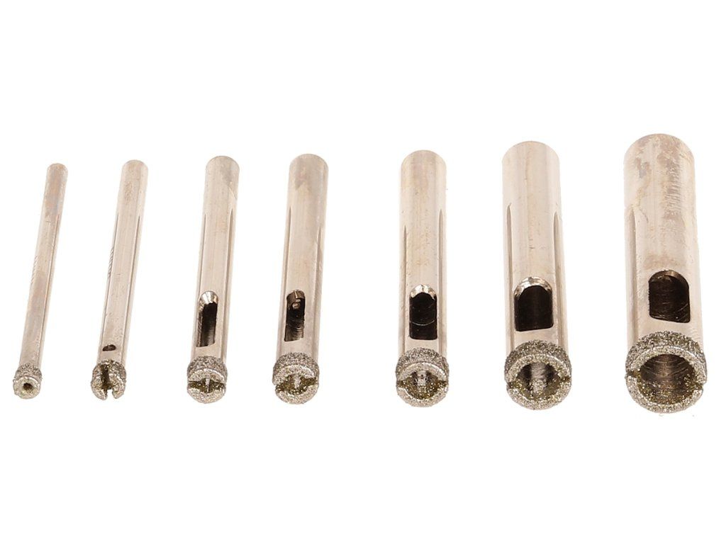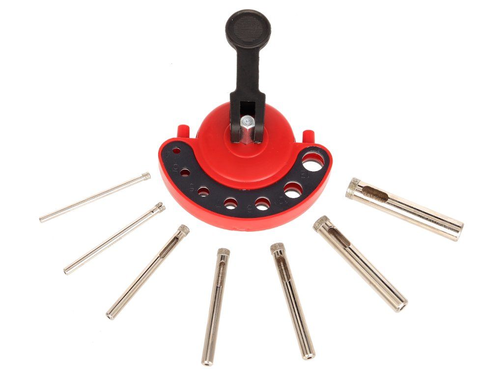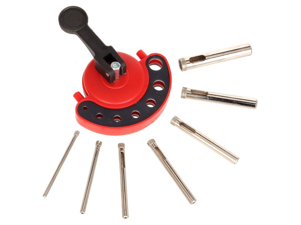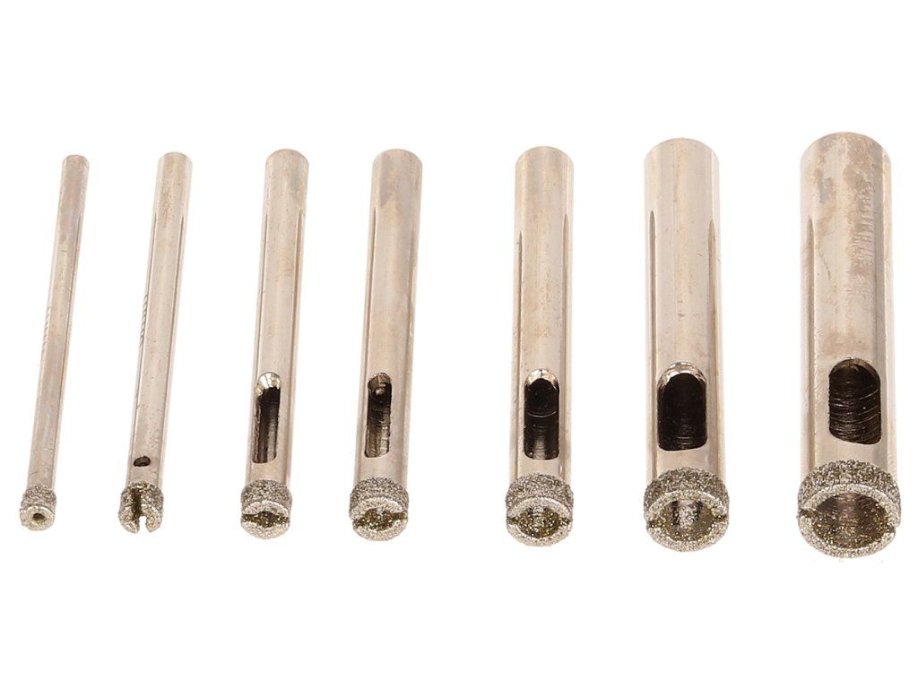 Diamantbohrkronen mit Bohrtiefen bis 30 mm, Gesamtlänge 60 mm, ergänzt mit Gummisaugnäpfen für eine einfache Handhabung. 6 mm Schaft, Bohrdurchmesser 4, 5, 6, 7, 8, 10 und 12 mm.