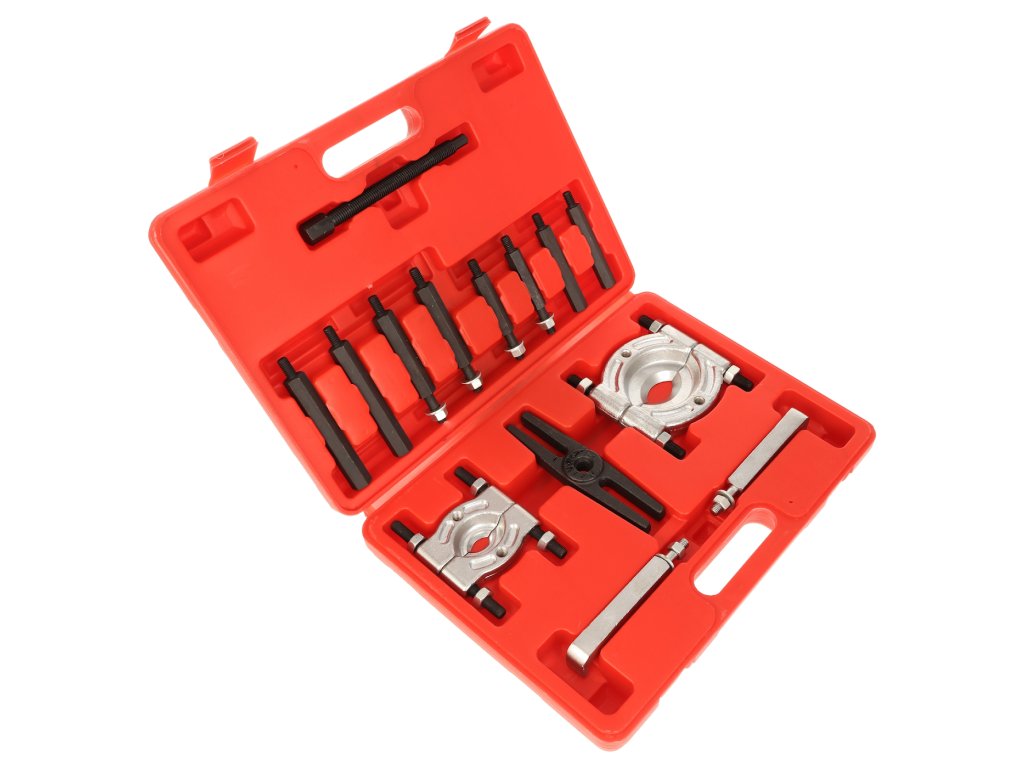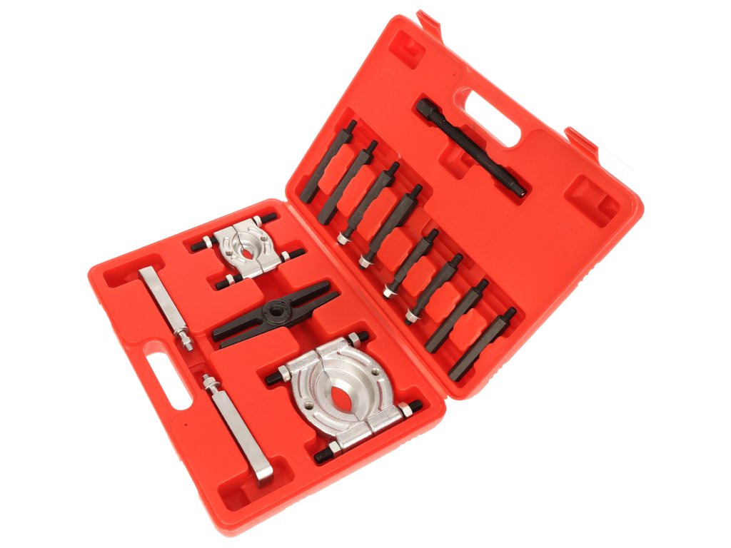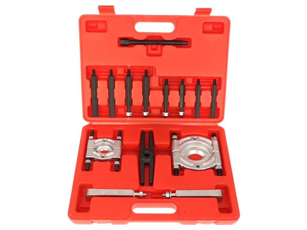 Mechanische Abziehvorrichtung für Lager, Zahnräder und Riemenscheiben von Wellen. Inhalt: geteilte Hülsen in 2 Größen für Lager-ø 30 – 50 und 30 – 75 mm, Distanzbügel, 2 Arme mit Haken, 8 St. Distanzbolzen und 1 St. Druckschraube. Max. Belastung der Abziehvorrichtung 2 t, Material CrV, im Kunststoffkoffer.