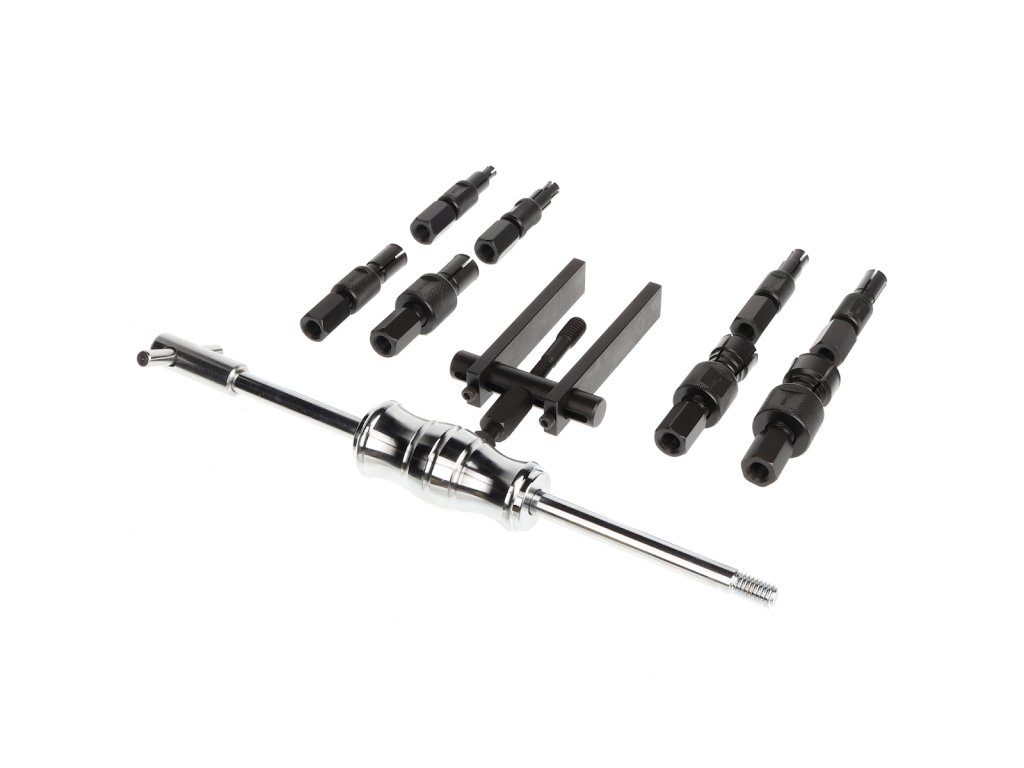 Zum Lagerabziehen über den Innendurchmesser mittels reversiblem Hammer bestimmt. Der Vorrichtungssatz enthält eine 390 mm lange Schraubwelle, 0,9 kg schweren Schlaghammer, Ausziehvorrichtung mit Stütze, und Klemmen mit einem Durchmesser von 8 - 10, 10 - 12, 12 - 14, 15 - 17, 17 - 20, 20 - 24, 25 - 29 und 30 - 32 mm. In einem Kunststoffkoffer geliefert.