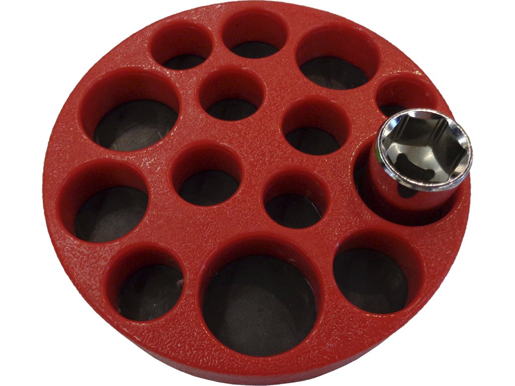 Dient zur Aufbewahrung von 14 St. Steckschlüsseln 1/4"; 3/8" und 1/2". Öffnungen von Ø 22 mm bis 44 mm. Ø des Halters 165 mm. Aus Kunststoff hergestellt.