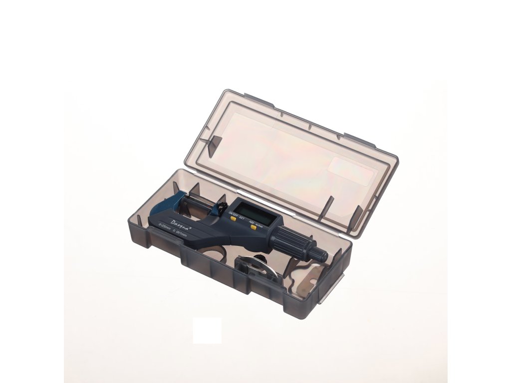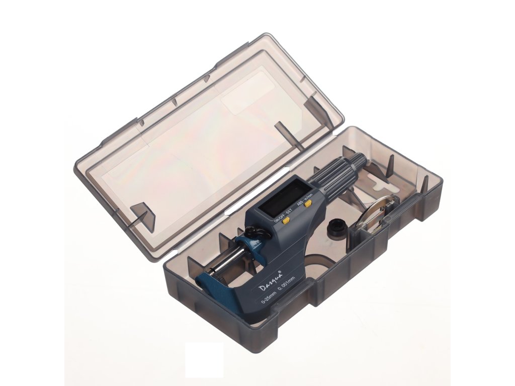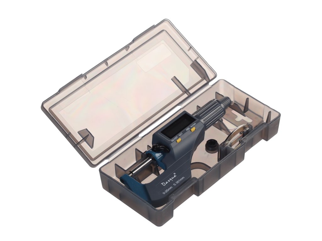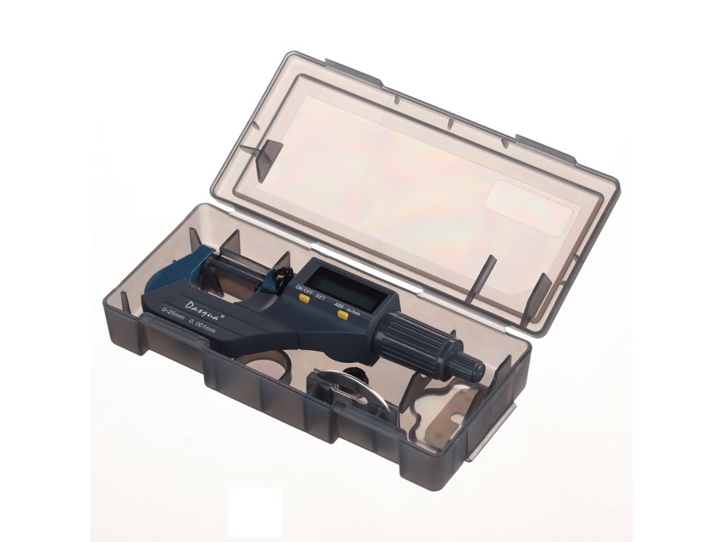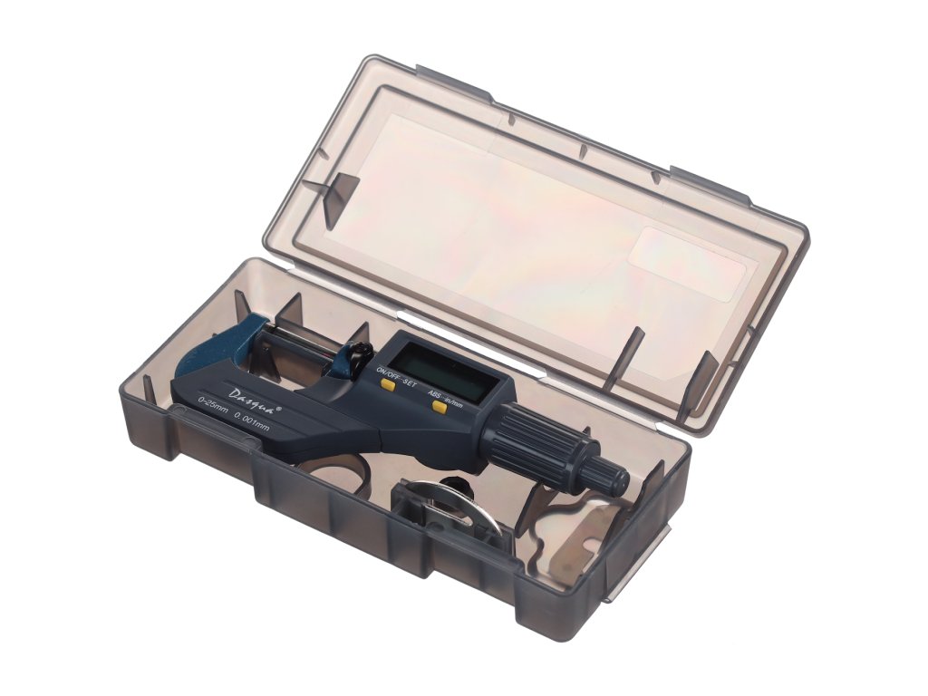Digitale Mikrometerschraube, Messbereich 0 – 25 mm, Auflösung 0,001 mm. Messung in Millimetern und Zoll, großes LCD-Display. Batterie CR2032, nicht im Lieferumfang enthalten. In einer Kunststoffbox geliefert.