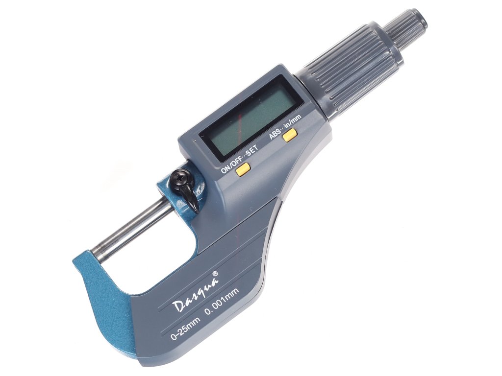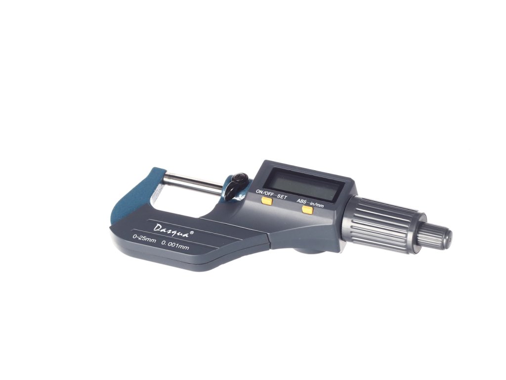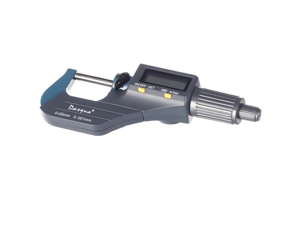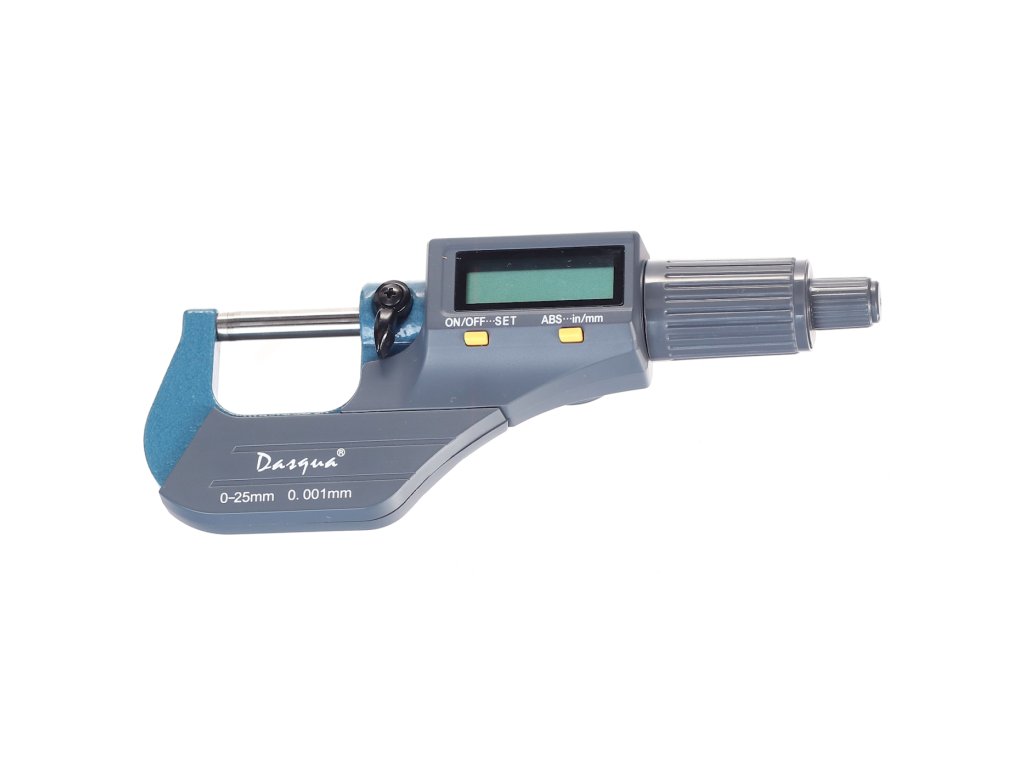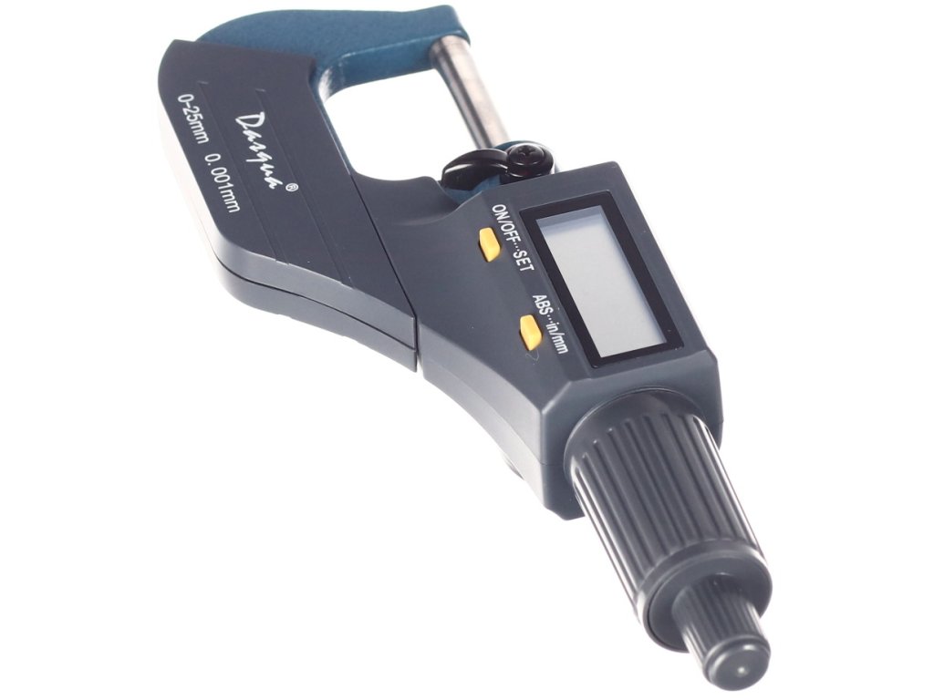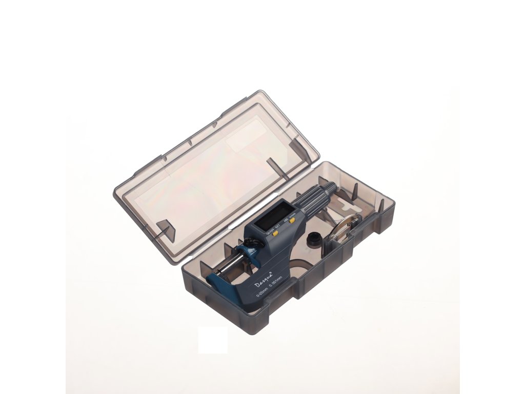 Digitale Mikrometerschraube, Messbereich 0 – 25 mm, Auflösung 0,001 mm. Messung in Millimetern und Zoll, großes LCD-Display. Batterie CR2032, nicht im Lieferumfang enthalten. In einer Kunststoffbox geliefert.