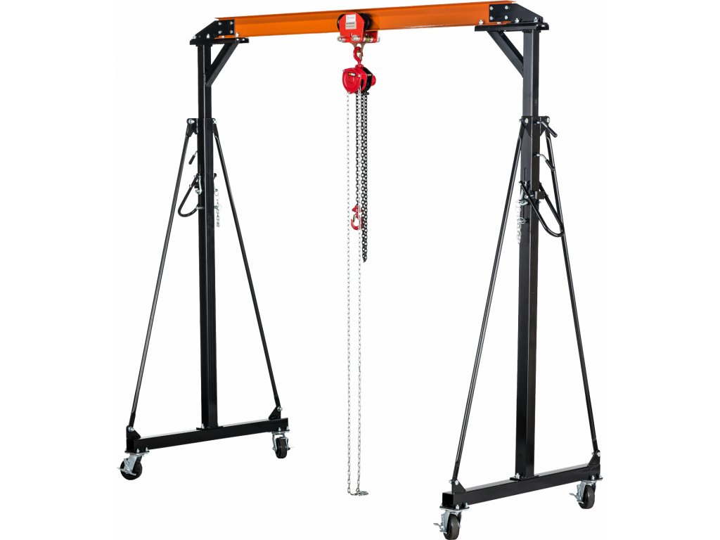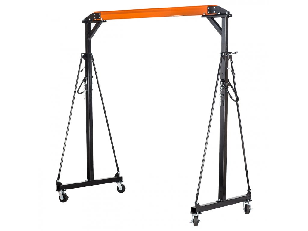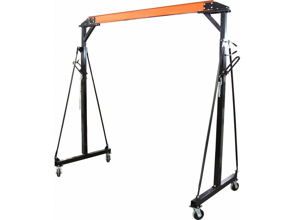 Fahrbarer Portalkran mit Rädern, Tragfähigkeit 1 000 kg. Mechanischer Hub, Betriebshöhe 2 400 – 3 600 mm, Säulenabstand 2 370 mm. Balkendurchschnitt IPE, Höhe 120 mm, Breite 75 mm.
