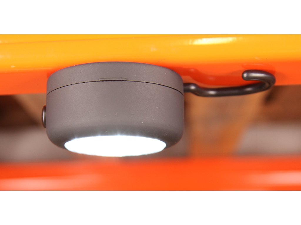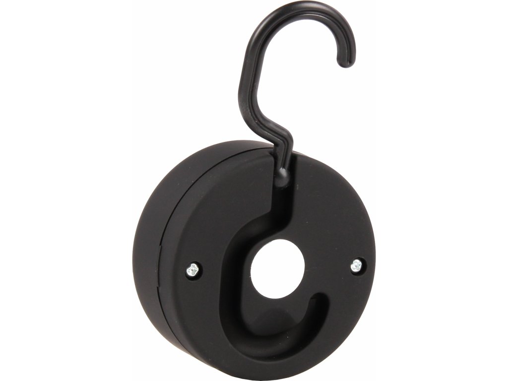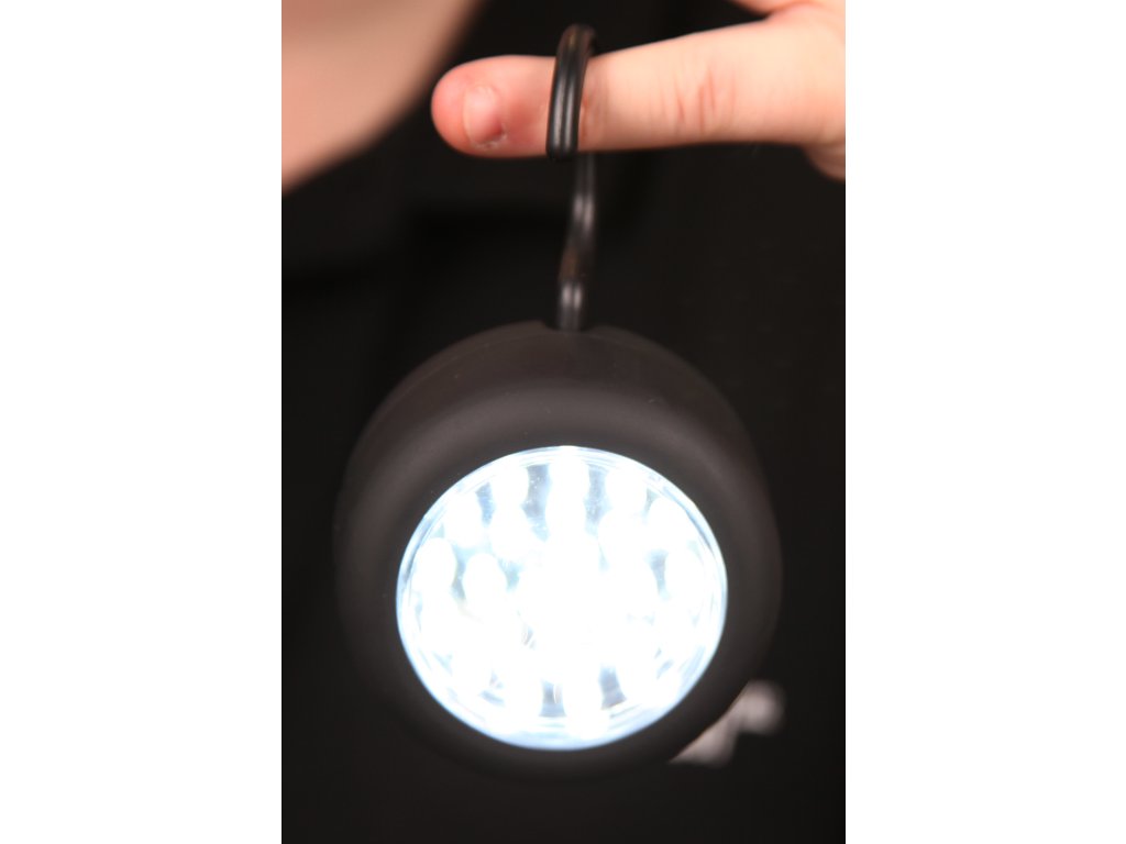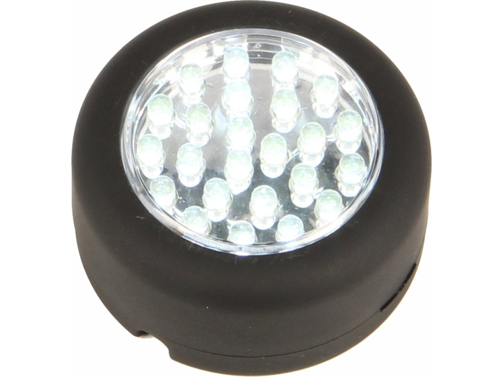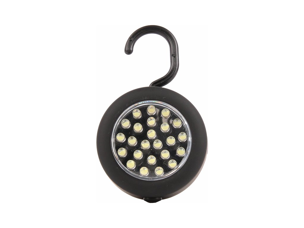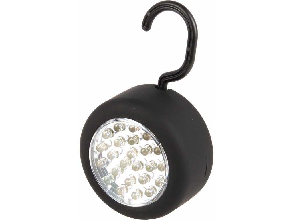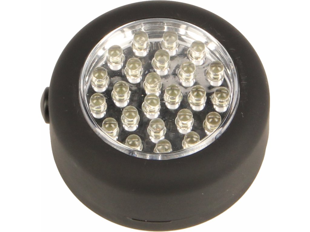 Runde Kunststoffleuchte, Durchmesser 70 mm, mit 24 LEDs, klappbarem Haken und Magnet ausgestattet. Einspeisung 4,5 V mit 3 Batterien Typ AAA, Leuchtstärke 10 – 12 cd. Für Montagearbeiten, als Notfalllicht für den Haushalt, Camping, Garage usw. geeignet.