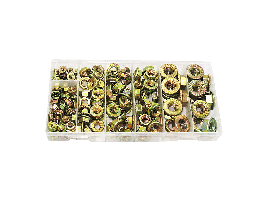 Im Set enthalten sind 140 St. verzinkte Muttern mit Zahnflansch, der unbeabsichtigtes Lösen der Muttern verhindert. 20 St. M5 × 0.8; 40 St. M6 × 1; 20 St. M8 ×1,25; 20 St. M10 × 1,25; 20 St. M10 ×1,5; 10 St. M12 × 1,25 a 10 St. M12 × 1,75 mm. In einer Kunststoffbox verpackt.