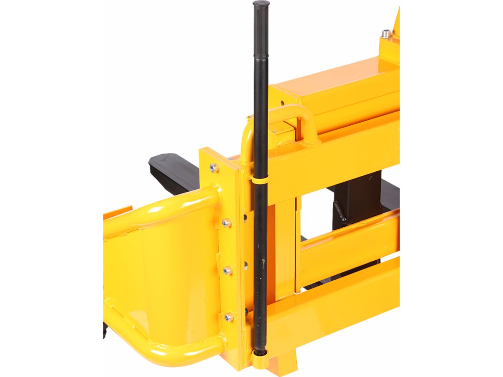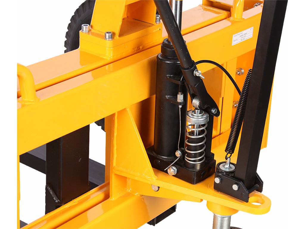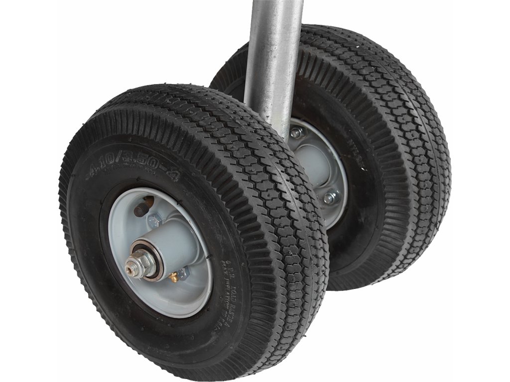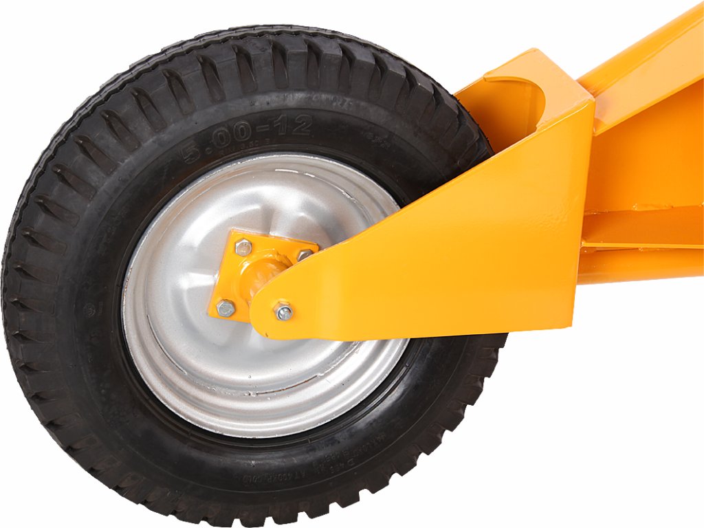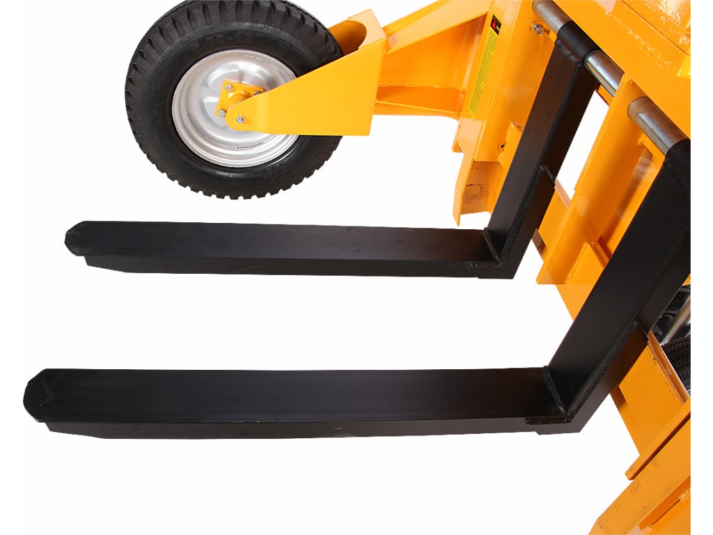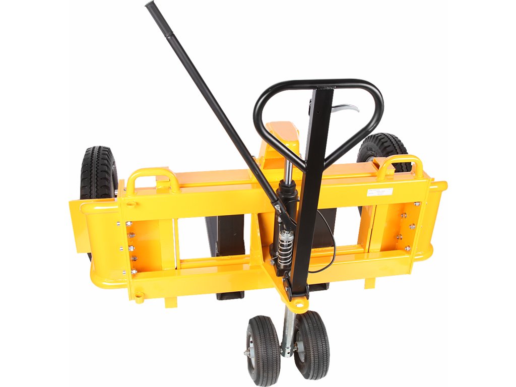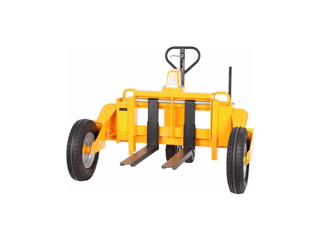 Zur einfachen Palettenmanipulation auf unebenen Böden. Die Palette wird durch eine einzige Hebelbetätigung gehoben. Einfache Lagerung. Tragfähigkeit 1.200 kg. Einstellbarer Gabelabstand 230 – 710 mm. Gabellänge 855 mm, Breite 100 mm. Hub 68 – 205 mm. Radabstand vorne 1 417 mm, ø 550 × 132 mm, Lenkradabstand hinten ø 250 × 100 mm.