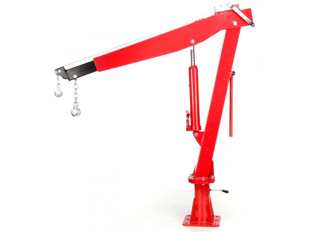 Praktischer Kran für den Einsatz in der Werkstatt, auf einer Rampe, in Schwerbetrieben oder zur Montage auf Wagenkasten geeignet. Eine leichtere Last kann auch aus niedrigeren Höhen mit der integrierten Winge angehoben werden (Seillänge mit Haken 9,4 m). Tragfähigkeit bis zu 900 kg, Festhakenhub 400 – 1 770 mm, hydraulischer Armhub, Auszieharmlänge 1 200 – 1 830 mm. Grundgestell um 360° drehbar. Gesamthöhe 1 430 mm, Montage-Grundgestell quadratisch 270 mm, Befestigungsöffnung 20 mm, Abstand 105 mm.