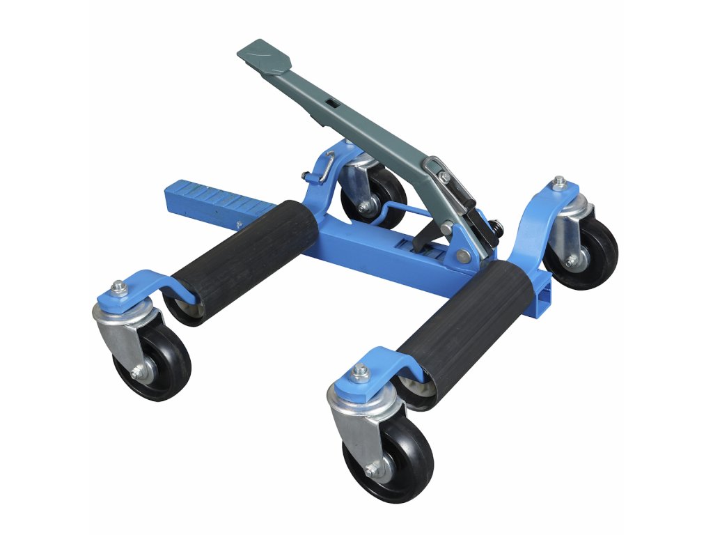 Mechanischer PKW-Radheber mit 4 Nylonrädern (Ø100 × 34 mm). Bei Verwendung von 4 Stück ermöglicht es eine einfache Handhabung des Fahrzeugs auf kleinem Raum. Die Tragfähigkeit eines Wagenhebers beträgt 560 kg, der Raddurchmesserbereich beträgt 450 – 810 mm, der Arbeitsbereich der Zylinder beträgt 340 – 710 mm, die maximale Breite des Reifens beträgt 228 mm.