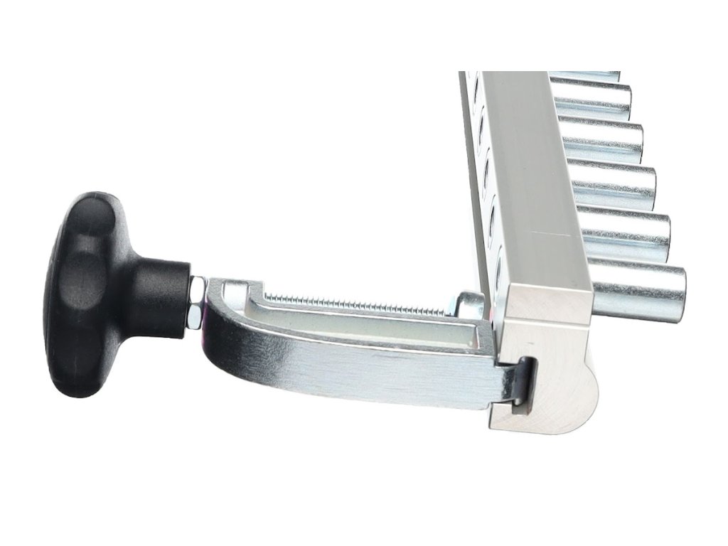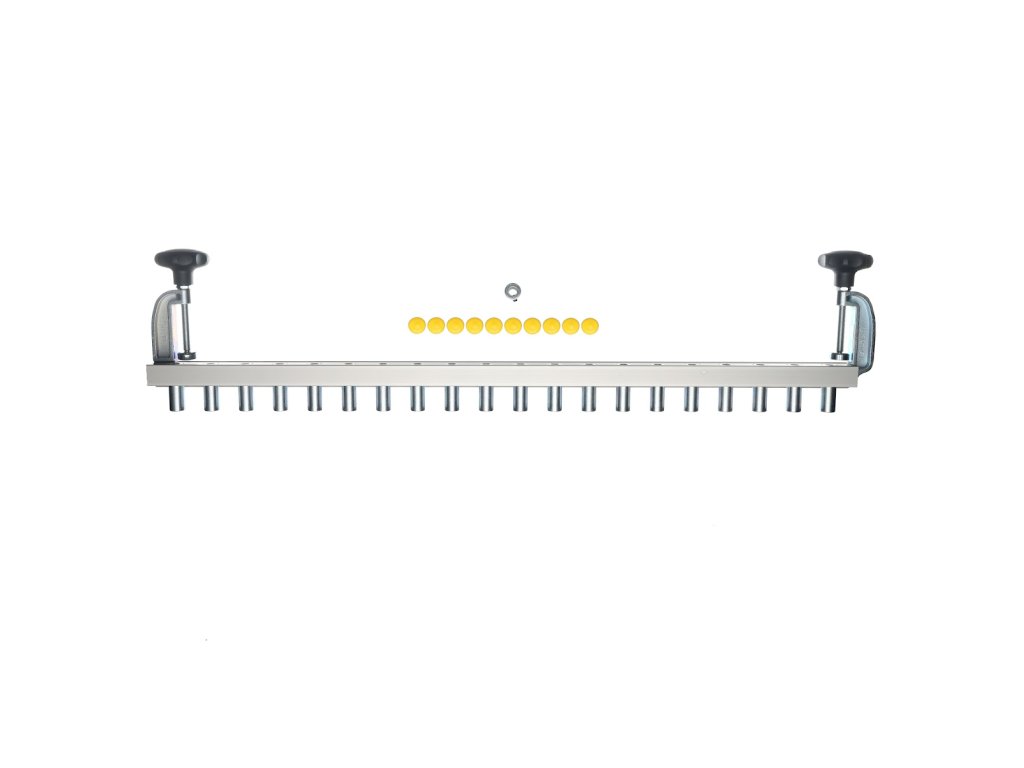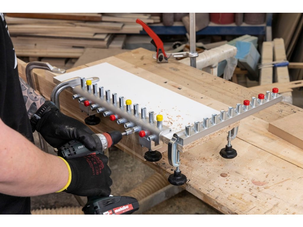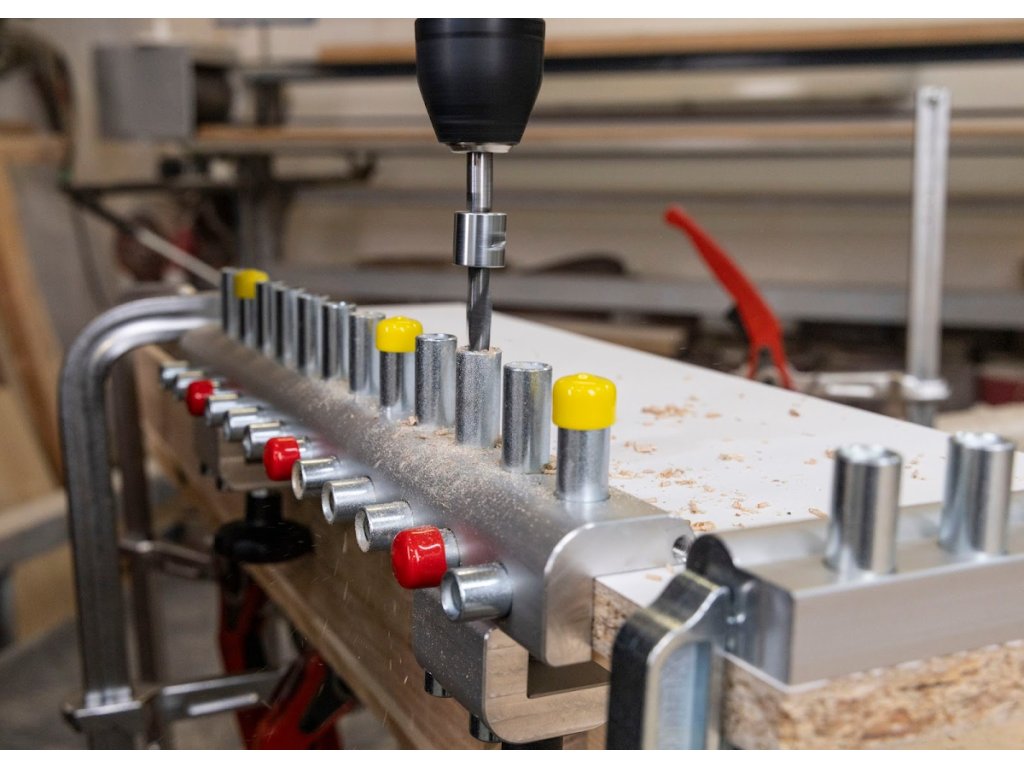 Tiefenanschlag neu KOSTENLOS - in jedem Lieferumfang enthalten. Einzüge zum Abdecken der nichtbenutzten Buchsen für eine einfachere Orientierung und höhere Produktivität (neu KOSTENLOS in der Grundanlieferung). An der Kante von der Vorrichtung ist ein Strich in der Achse der Bohrbuchsen für ein einfaches Ausrichten der Vorrichtung. Seitenanschlag für einfaches Einpassen mit der Plattenkante ist Bestandteil eines Schraubstockes! (kann mit einer Schraube befestigt werden - dann entfällt das Anpassen des Anschlages bei jedem Spannen). Das Gehäuse aus einem vergrößerten massiven Profil gewährleistet eine erhöhte Steifigkeit gegenüber den Modellen der Wettbewerber. Besonders bei der Arbeit mit massivem Material schätzen Sie die Möglichkeit der Vorrichtungsaufnahme auf Platten bis 35 mm Stärke!!!