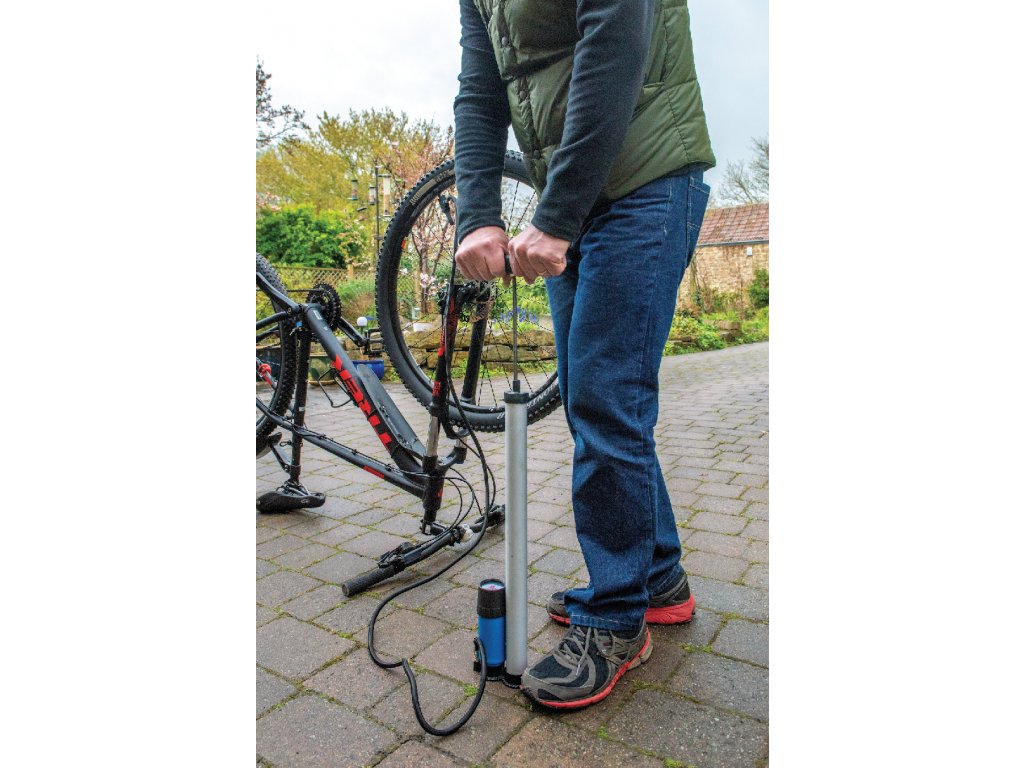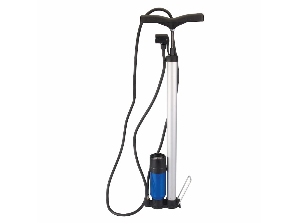 Handpumpe zum Aufpumpen von Booten, Pools oder Fahrradreifen. Kompakte Größe, stabiles Bein für Stabilität. Der Multi-Ventilkopf ist für Presta-, Schrader- und Dunlop-Ventile geeignet. Druck 0 – 7 bar.