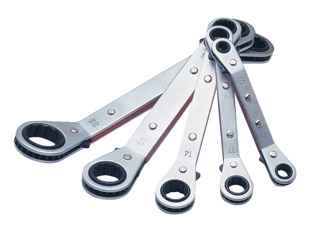 Set beidseitiger Ratschen-Ringmaulschlüssel, um 25° gebogen. Im Set sind folgende Schlüssel enthalten: 6 × 8; 10 × 11; 13 × 14; 15 × 17 und 19 × 22 mm.