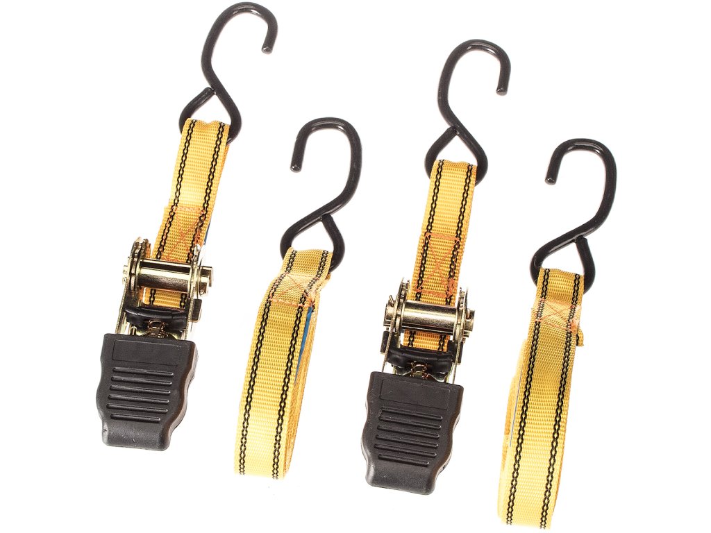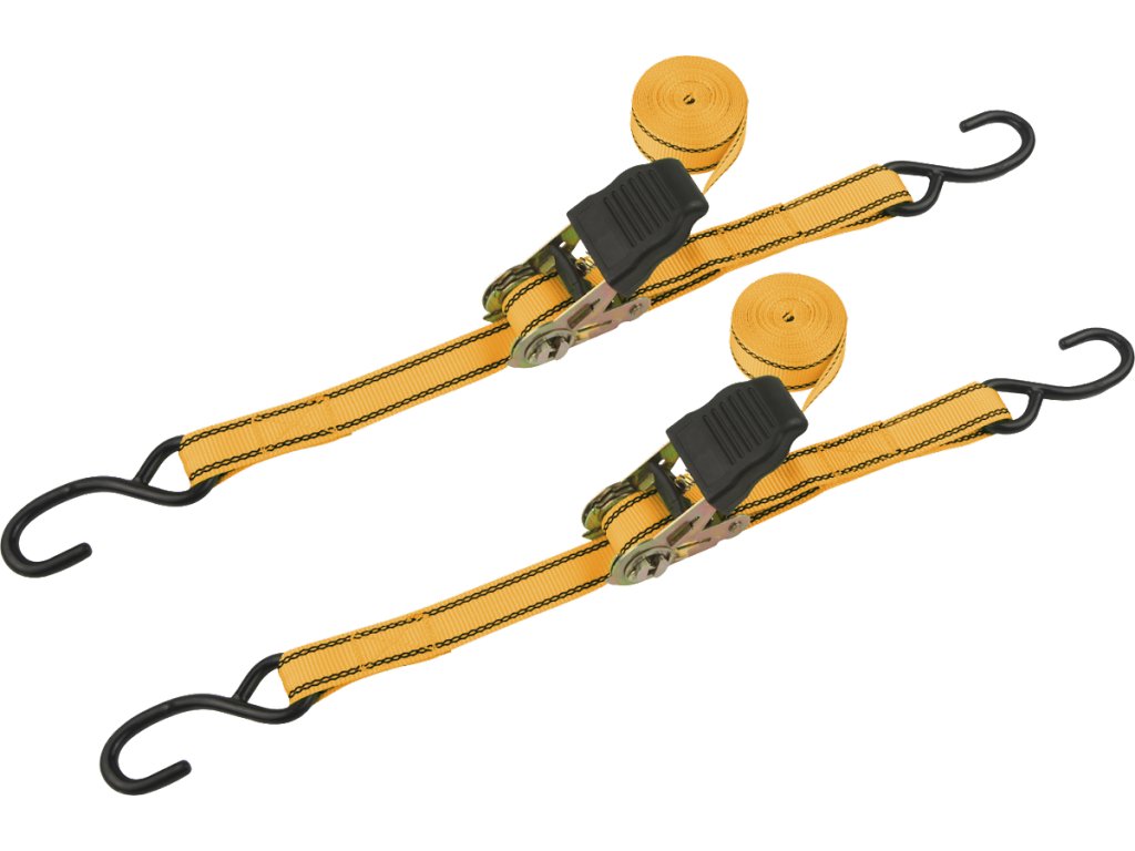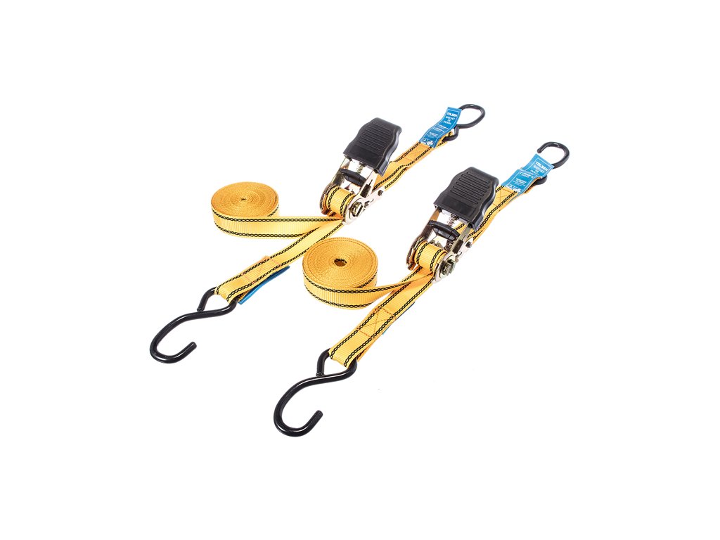 Zweiteiliges Spanngurt-Set. Verzinkte Stahlratsche. Gurtlänge 5 m, Breite 25 mm, Spannkraft 225 kg, Festigkeitsgrenze 450 kg.