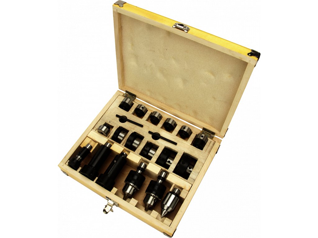 Spannelemente-Set für Revolverkopf REVOLVER6 (Bestell.-Nr. 41052003) zum Drehbankreitstock beinhaltet 2 Spannfutter 1 – 13 mm, Spannzangenbuchse ER16, Drehspitze, Gewindebohreraufnahme M3 – M12, Gewindeösenaufnahme M3 – M12. Montagedurchmesser 16 mm.