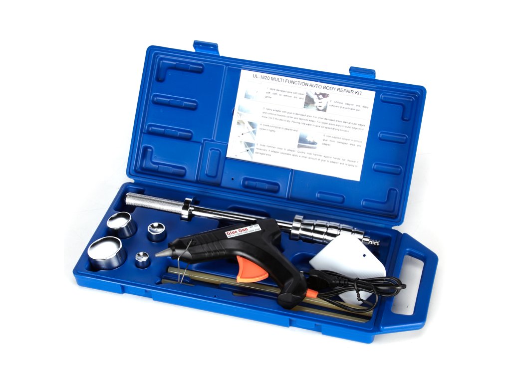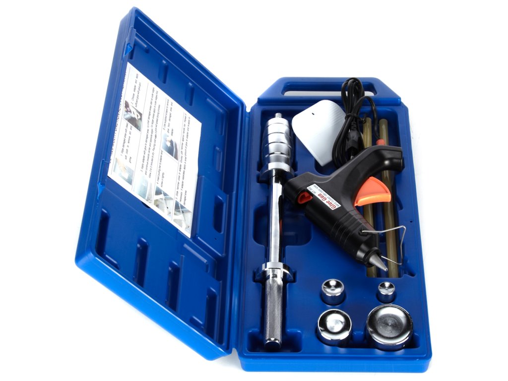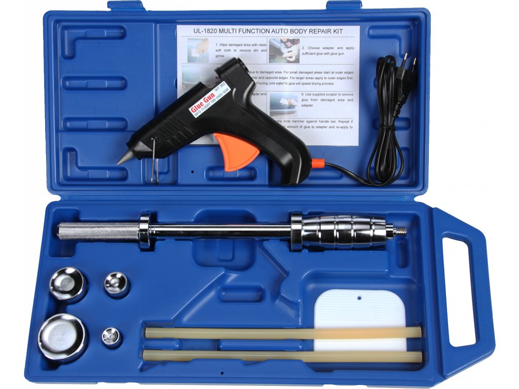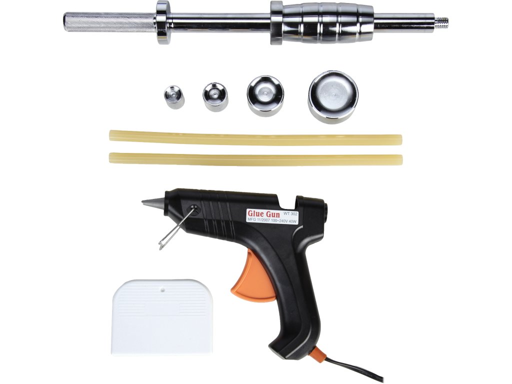 Der reversibele Hammer mit geklebter Lasche nutzt die Adhäsion des Schmelzklebers für den Kontakt mit dem auszurichtenden Karosserieteil. Der Satz beinhaltet 4 St. Laschen mit 19; 25,5; 38 und 51 mm Durchmesser zum Auswahl nach der Defektgröße, eine Heißklebepistole 240 V/50 Hz, 40 W, eine Kunststoffkratze zum Entfernen der Klebstoffreste und einen reversiblen Hammer mit Spanngewinde 1/2" - 12 tpi, alles übersichtlich in einem Kunststoffkoffer aufbewahrt.