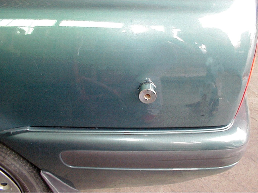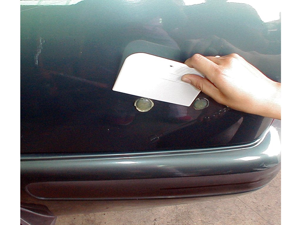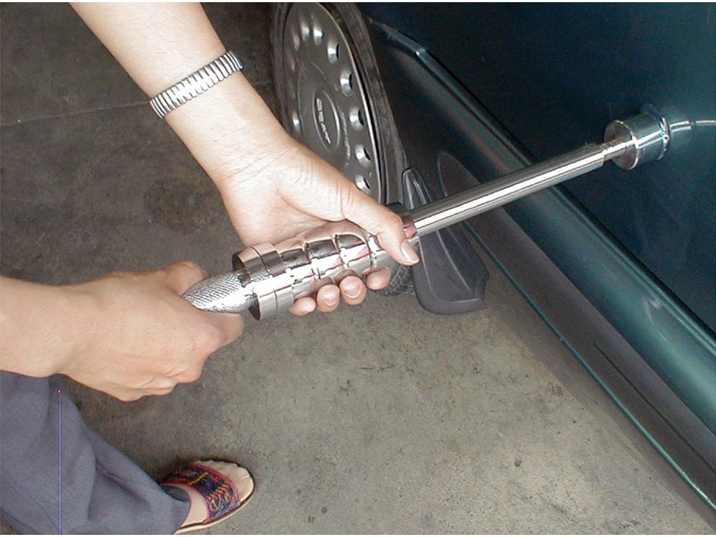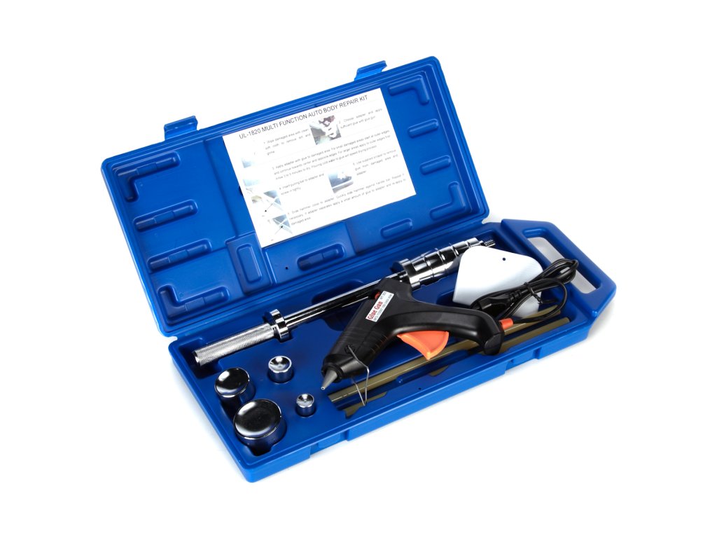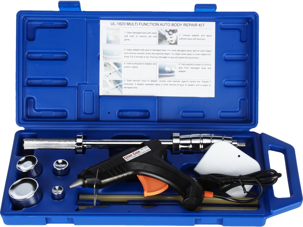 Der reversibele Hammer mit geklebter Lasche nutzt die Adhäsion des Schmelzklebers für den Kontakt mit dem auszurichtenden Karosserieteil. Der Satz beinhaltet 4 St. Laschen mit 19; 25,5; 38 und 51 mm Durchmesser zum Auswahl nach der Defektgröße, eine Heißklebepistole 240 V/50 Hz, 40 W, eine Kunststoffkratze zum Entfernen der Klebstoffreste und einen reversiblen Hammer mit Spanngewinde 1/2" - 12 tpi, alles übersichtlich in einem Kunststoffkoffer aufbewahrt.