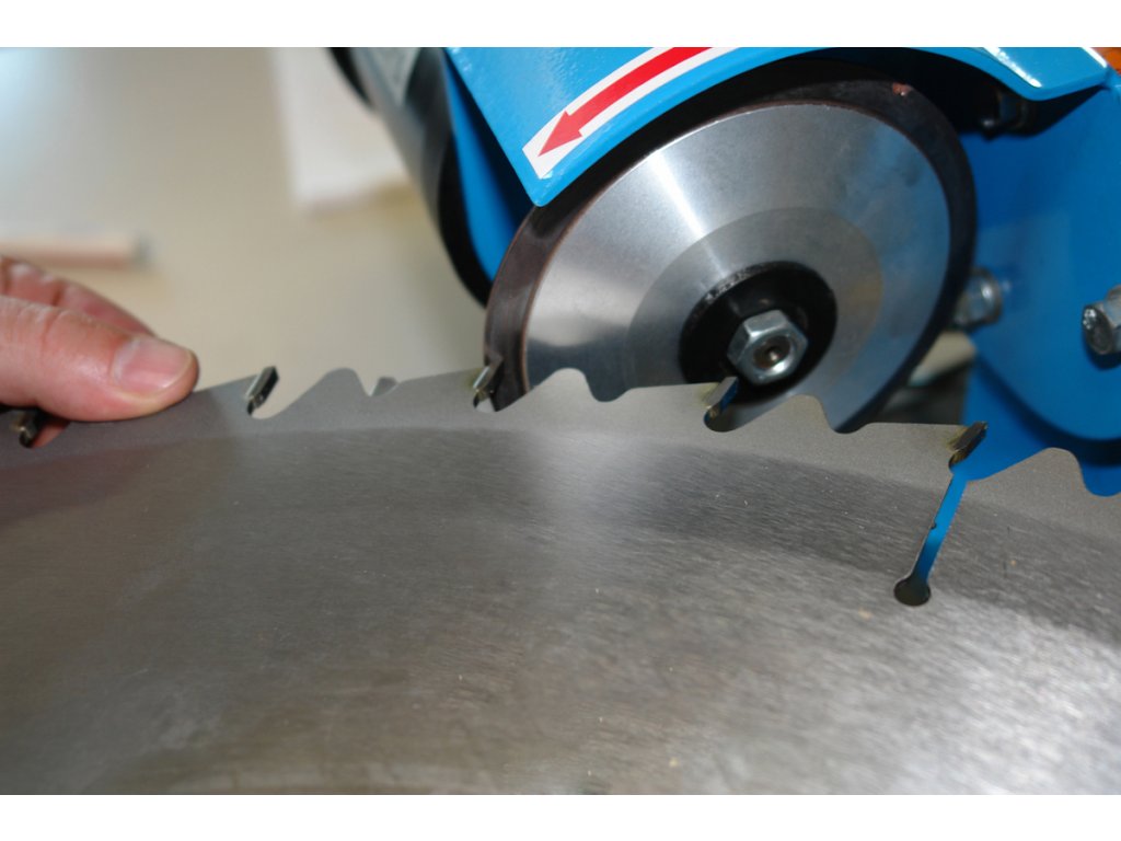 Funktion: Schleifen der Stirn- und Rückseiten von Sägezähnen mit einer verstellbaren Schleifscheibe (± 30°) und einem Auflagetisch (+ 30/- 80°); Präzise Schleifscheibenführung durch Schlitten.