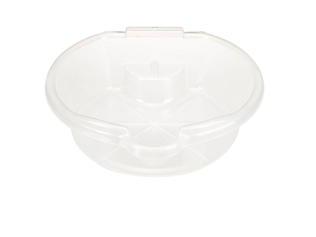 Unmittelbare Volumenkontrolle der abgelassenen Flüssigkeit durch Skala bis 4,5 l auf der Behälterinnenseite. Transparente Ausführung aus PP, Temperaturbeständigkeit –15 bis 105 °C, Skalateilung je 0,5 l, Rundbehältermaße 320 × 320 × 110 mm.