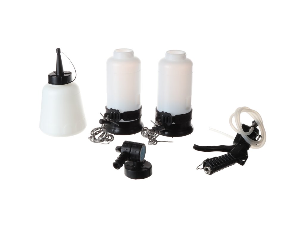 Praktische Garnitur für den Wechsel und die Entlüftung der hydraulischen Bremsen. Beinhaltet zwei Füllflaschen zum Anbringen an die Vorratsbehälter für ein stufenloses Nachfüllen der Flüssigkeit, Unterdruckabsauganlage mit Behälter 1 l für die gebrauchte Flüssigkeit und Schlauch mit Gummiadapter zum Aufsetzen auf die Entlüftungsschraube. Druckluftanschluss erforderlich.