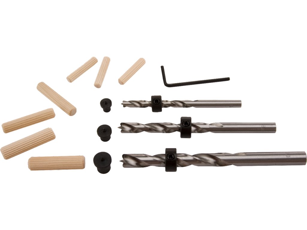 Die Garnitur beinhaltet 3 Dosen von Verbindungsstiften verschiedener Größen (300 Stück 6 × 30 mm, 150 Stück 8 × 40 mm, 100 Stück 10 × 40 mm), eine Flasche für Kleber mit Mundstück, 3 Stück Bohrer (6, 8, 10 mm) mit entsprechenden Anschlägen und 12 Stück Markierspitzen (6, 8, 10 á 4 Stück). Alles in einer Kartonschachtel verpackt.