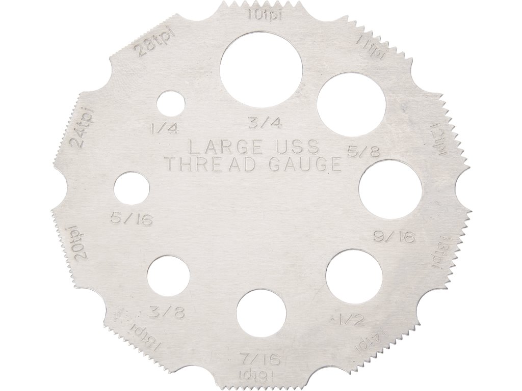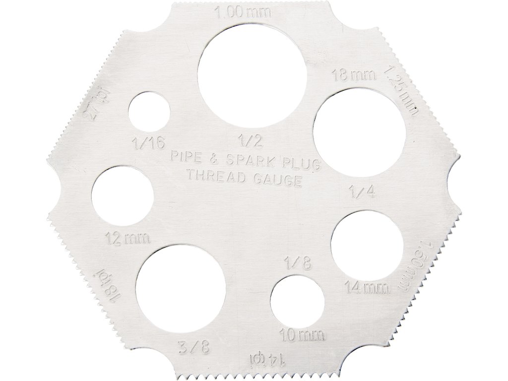 Garnitur von Gewindelehren für eine schnelle Orientierung und Ermittlung der Parameter eines unbekannten Gewindes. An vier Schablonen sind die Durchmesser und Gewindeprofile W 5 – 3/4″ × 10 – 44 tpi, M 2,5 – 22 × 0,45 – 2,5 mm angebracht. G 1/16″ – 1/2″ × 14 – 27 tpi und Zündkerzengewinde 10, 12, 14, 18 mm. Hergestellt aus Alu.