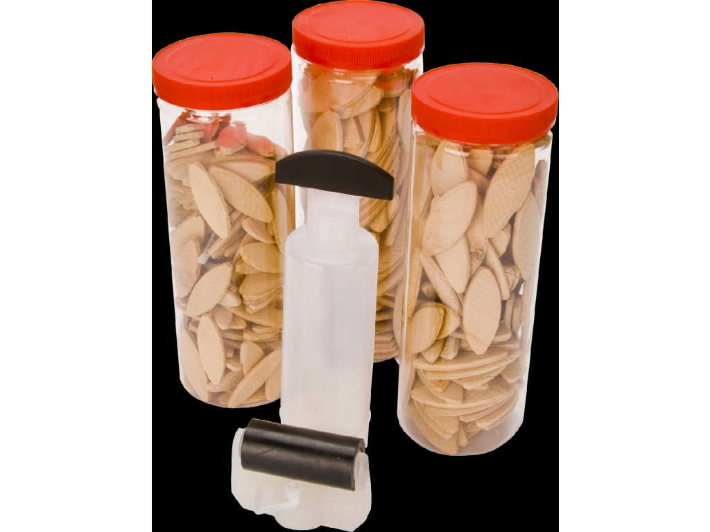 Die Garnitur beinhaltet 3 Dosen von Verbindungslamellen verschiedener Größen (150 Stück Gr. 0, 125 Stück Gr. 1, 100 Stück Gr. 2), Flasche für Kleber mit Applikator und Walze.