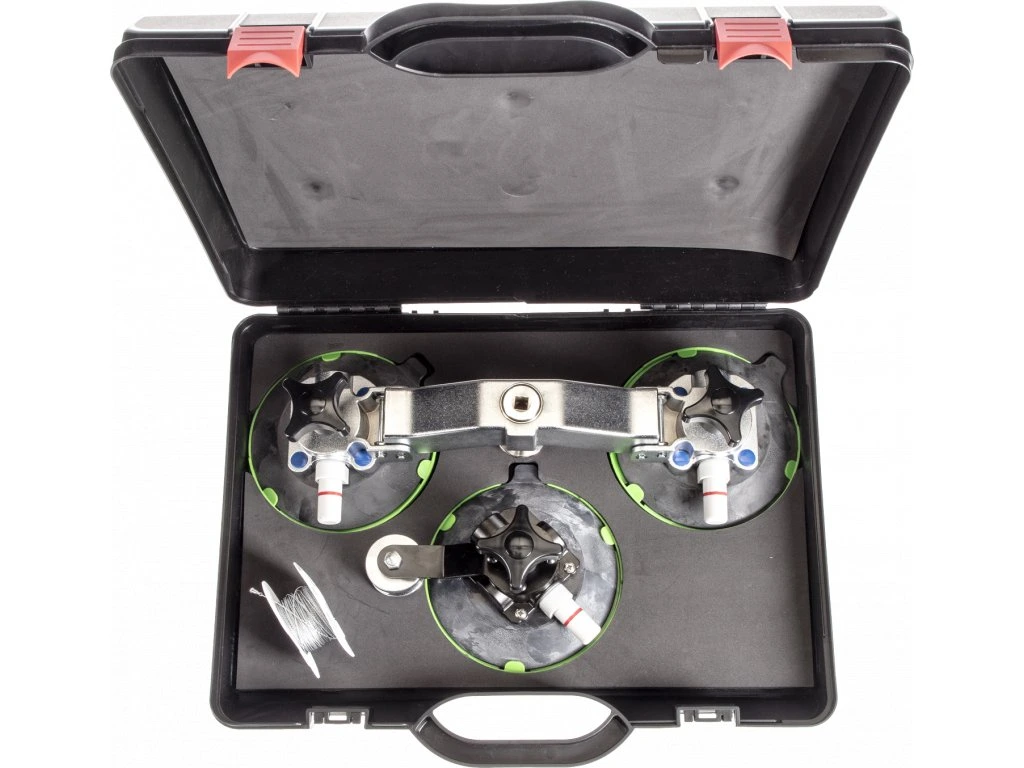 Inhalt: 1 einfacher Saugnapf mit Führungsrolle für Saite und 1 Doppel-Saugnapf mit Aufwickelrolle, knarrenbetrieben. Im Lieferumfang ist eine Saitenspule zum Autoscheibenabschneiden enthalten. Alles im Kunststoffkoffer aufbewahrt.