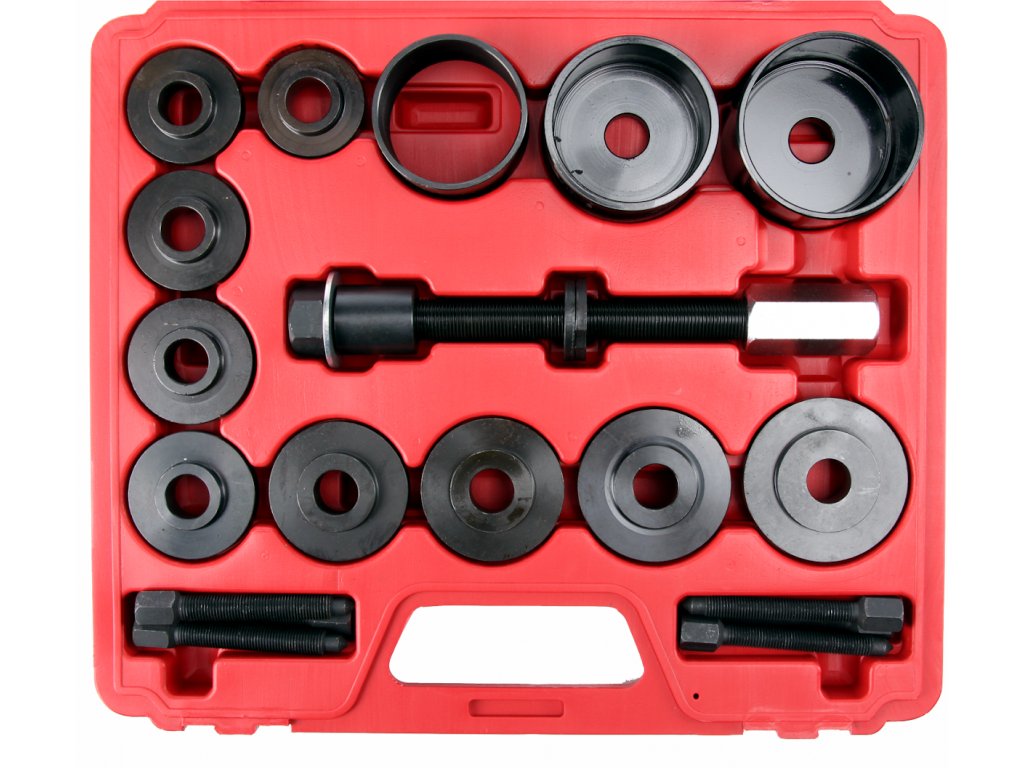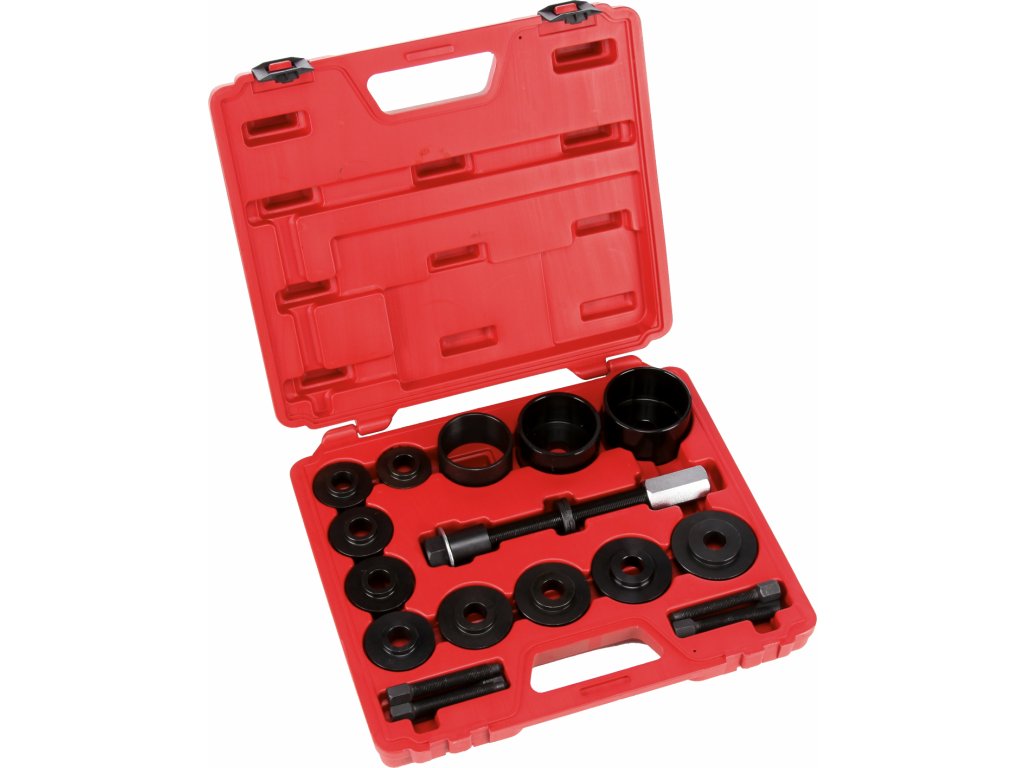 Garnitur vorgeschlagen für den Wechsel der Lager von den vorderen Rädern direkt am Fahrzeug mit einer Abziehschraube. Die Auswahl verschiedener Schalengrößen und Distanzbuchsen ermöglicht den Einsatz an den meisten verkauften Fahrzeugen. Der Satz ist für die Anwendung an der hydraulischen oder mechanischen Presse beim Ausbau der Lager, Buchsen und anderer rotierender Bauteile geeignet. Schalengröße: 55,5; 59; 62; 65; 66; 71,5; 73; 78; 84, 86 und 91 mm. Schraubenmaße: M12 × 1,5 und M15 × 1,5 mm. Im Kunststoffkoffer verpackt.