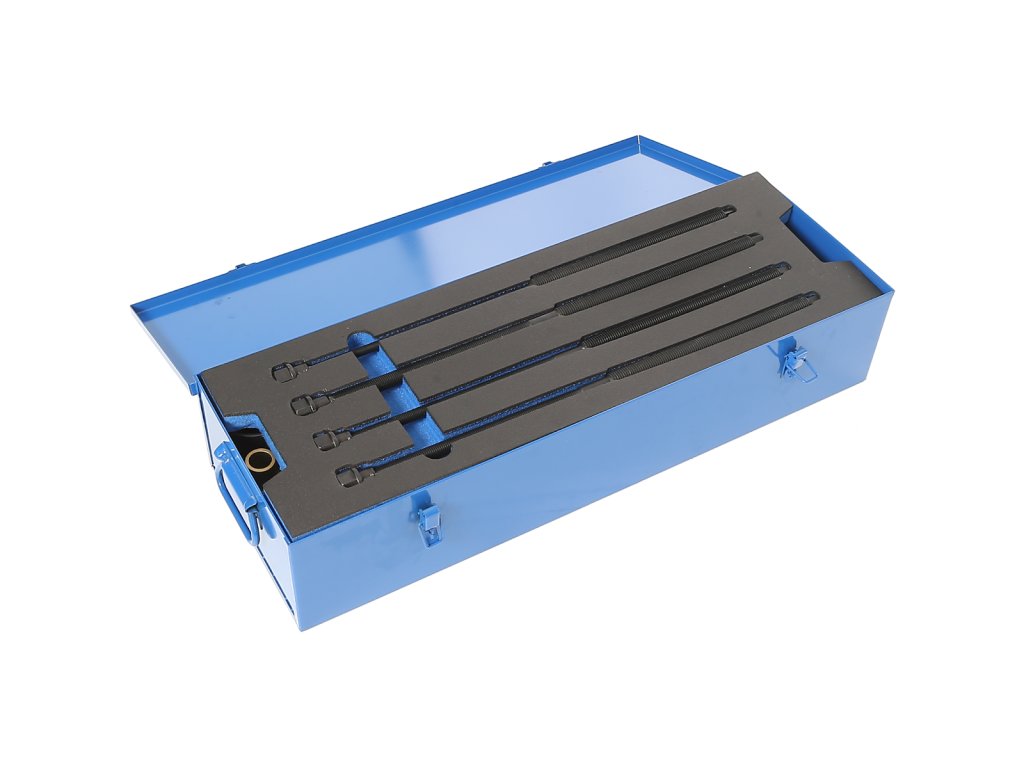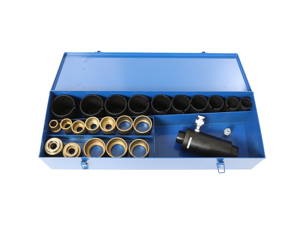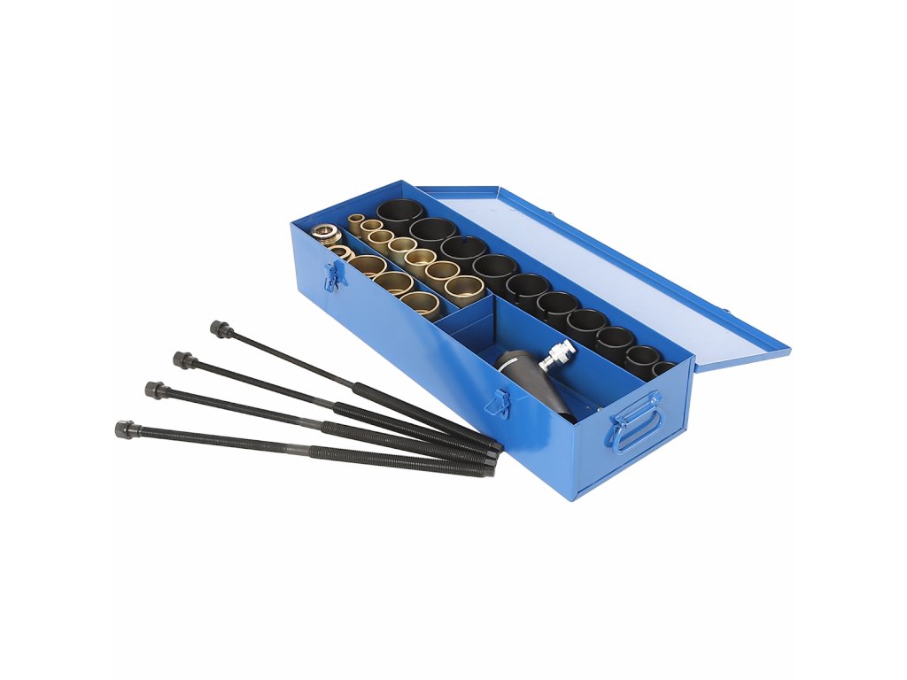 Ermöglicht bequeme und schnelle Demontage und Wechsel von Silentblöcken und LagernØ 30 – 75 mm. Inhalt: 2 Adapter; 570 mm lange Schrauben M10; M12; M14; M16, innere Einpresseinsätze Ø 30; 40; 46; 50; 54; 58; 64; 66; 70 und 72 mm, äußere Einpresseinsätze Ø 44; 50; 56; 62; 66; 70; 74; 78; 82 und 84 mm. Für korrodierte oder steife Teile kann ein Hydraulikzylinder mit 17 t Druckkraft verwendet werden. In einem Metallkoffer geliefert.