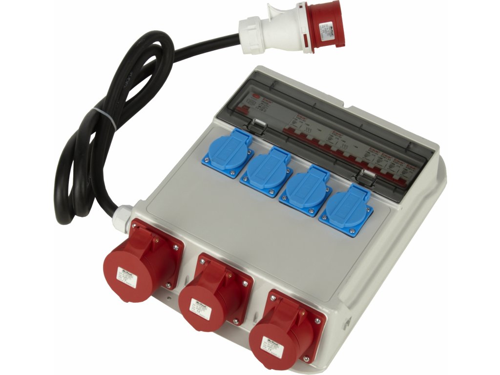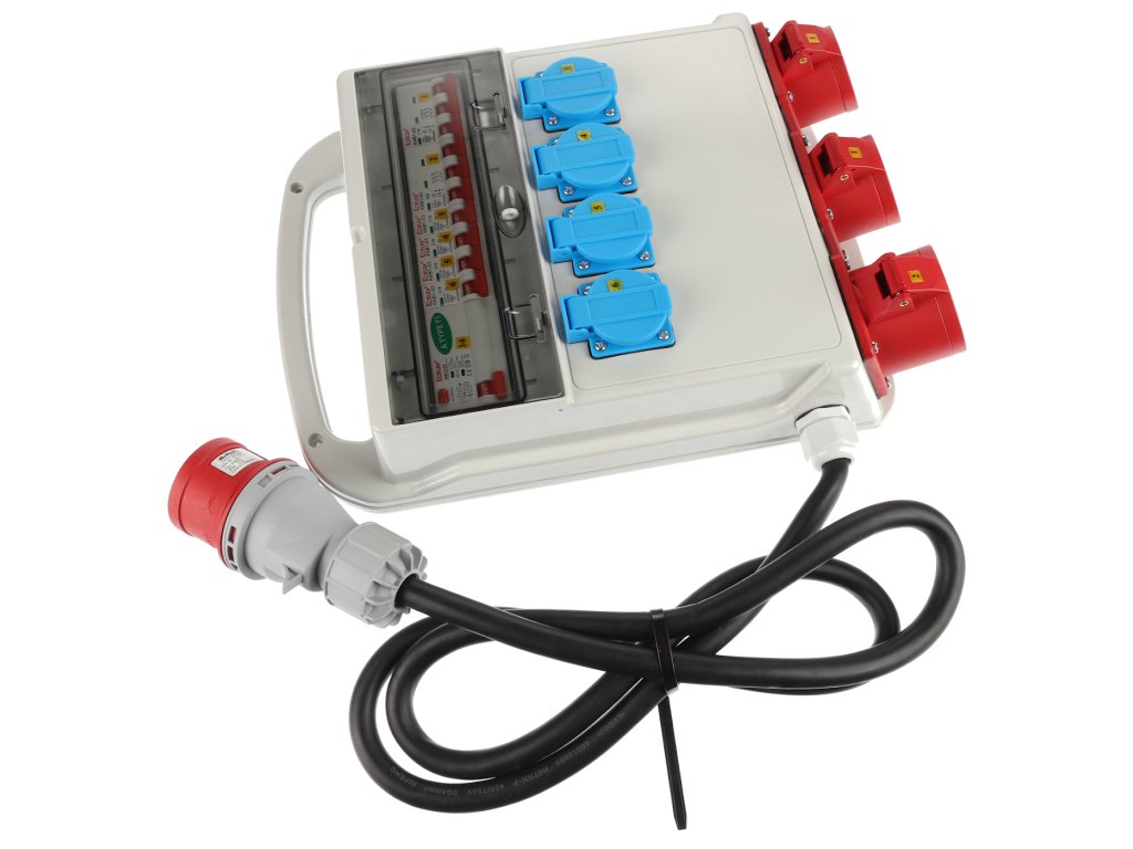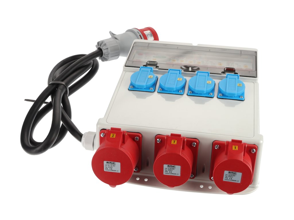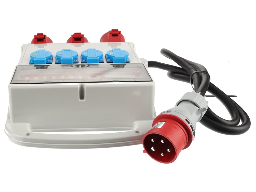 Mobiler Schaltkasten mit Sicherungen, Eingang: Gabel 32 A – 3L+N+PE, Kabel HO7RN-F,5G × 4 mm² – 2 m, Ausgang: 1 CEE-Steckdose 32 A – 3L+N+PE, 2 CEE-Steckdosen 16 A – 3L+N+PE, 4 DIN-Steckdosen 16 A/230 V, Typ F. Schutzart IP44.