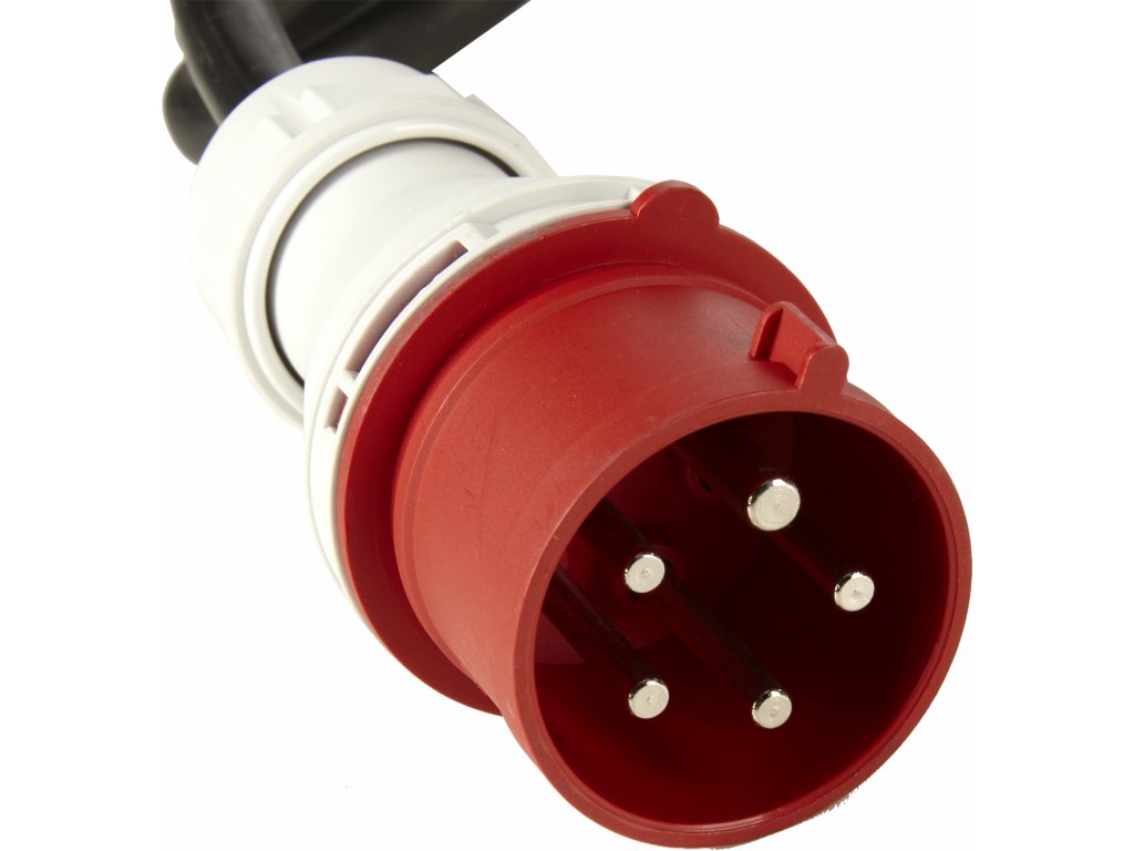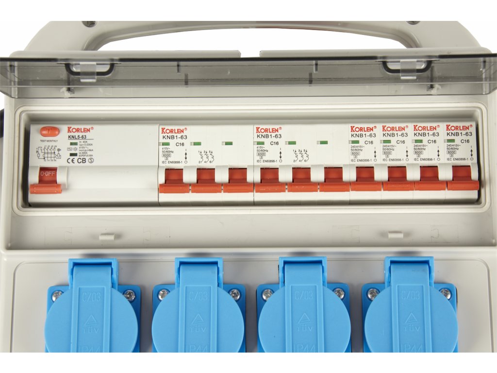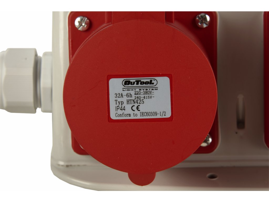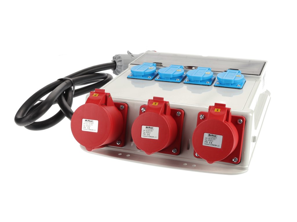Mobiler Schaltkasten mit Sicherungen, Eingang: Gabel 32 A – 3L+N+PE, Kabel HO7RN-F,5G × 4 mm² – 2 m, Ausgang: 1 CEE-Steckdose 32 A – 3L+N+PE, 2 CEE-Steckdosen 16 A – 3L+N+PE, 4 DIN-Steckdosen 16 A/230 V, Typ F. Schutzart IP44.