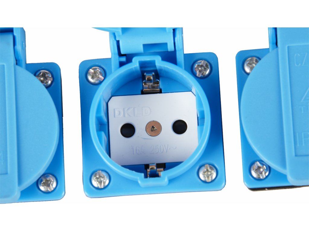 Steckdosen 16 A/230 V des Typs F (CEE 7/4) Schuko mit Erdungslitzen. Sicher verwendbar mit Hybridsteckern Typ E/F(CEE 7/7) mit Erdungsöffnung für den Stift wie auch mit Erdungslitzen, ferner für früher verwendete Steckdosen des Typs C (CEE 7/16 – Flach und 7/17 – rund) mit der Einschränkung, dass der Schutzleiter nicht funktioniert.