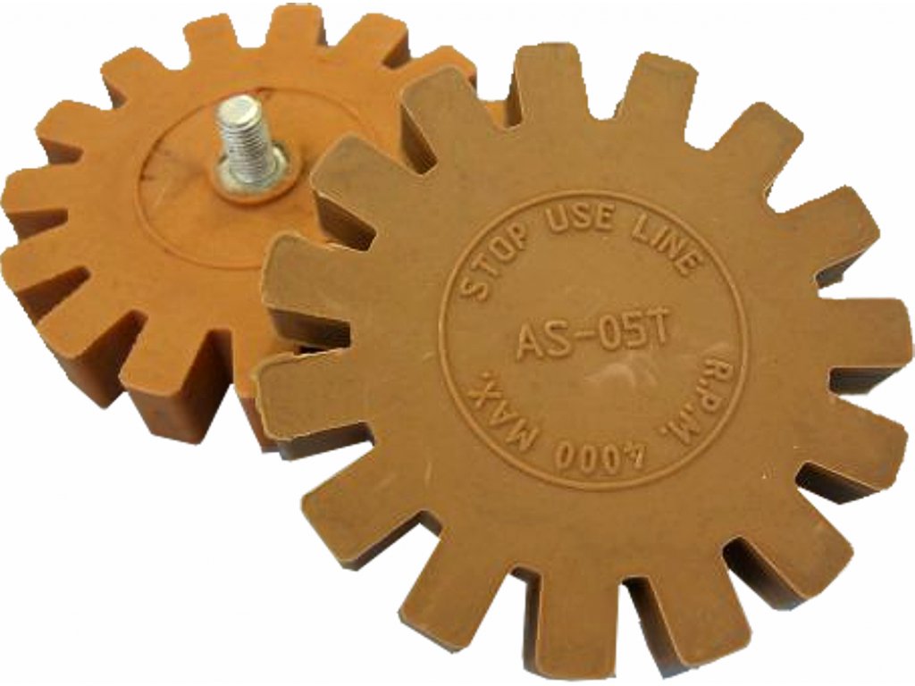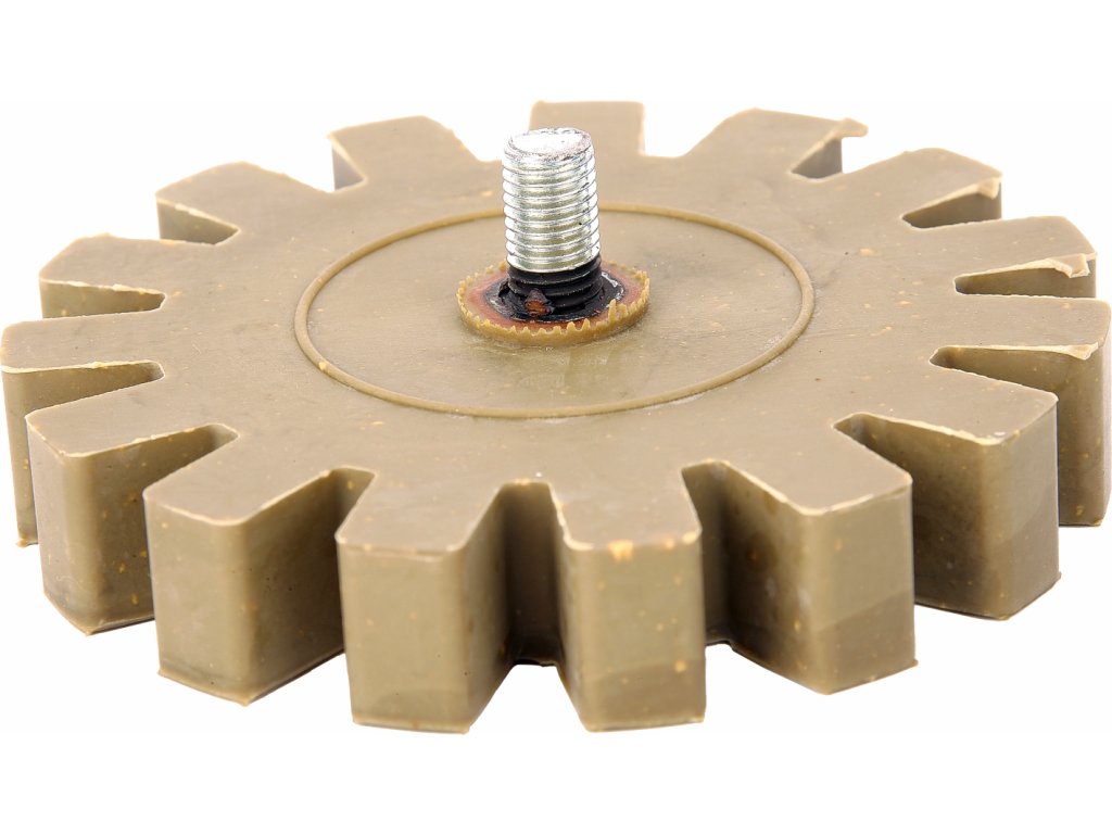 Scheibe zum Entfernen der Folien von Karosserien und weiterer glatter, kompakter und nicht spröder kunstharzlackierten Oberflächen. Das Profil wurde für gegliederte Flächen entworfen. Der spezieller Gummi, aus welchem die Scheibe hergestellt ist hinterlässt keine Spuren und beschädigt nicht die zu behandelnde Oberfläche. Bestimmt zum Spannen in ein beliebiges Spannfutter - es muss ein Adapter AS05C mit Schaft mit 6 mm Durchmesser eingesetzt werden. Zahnscheibe, 88 mm Durchmesser, 15 mm stark, Spanngewinde 3/8" × 24/1", max. Drehzahl 4 000 U/min.