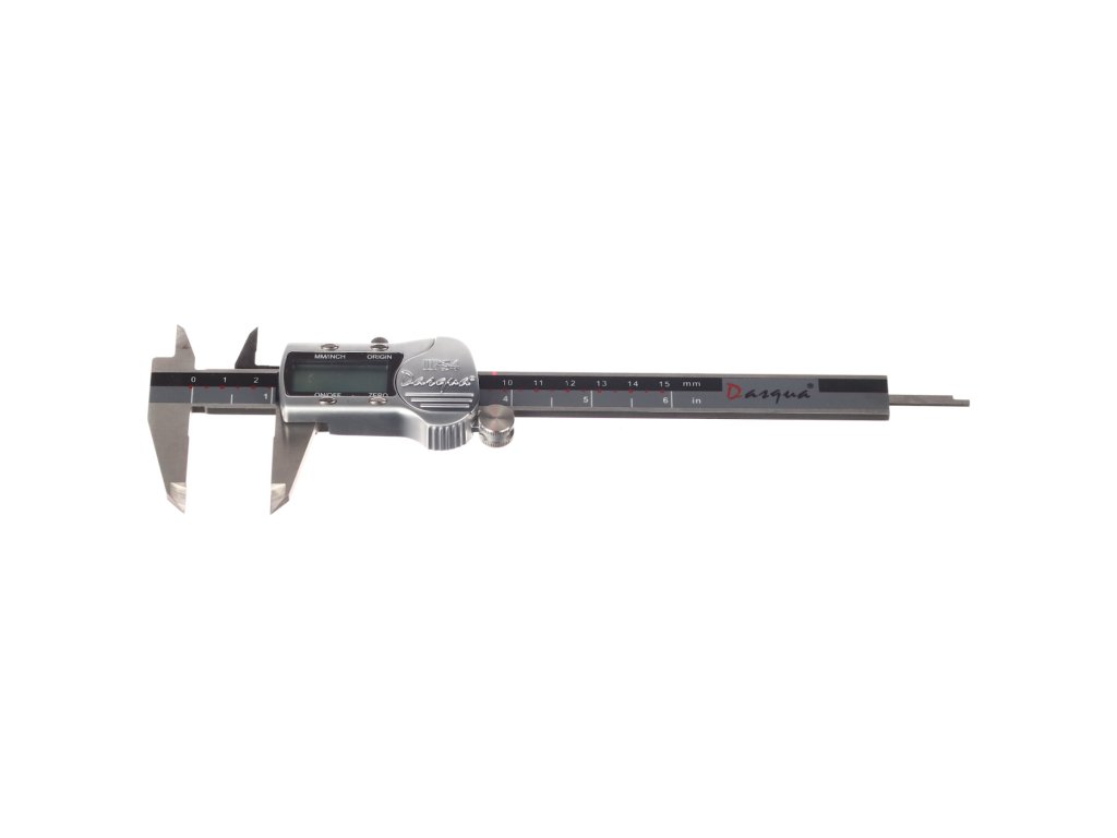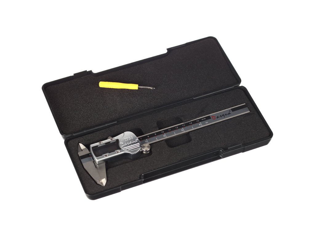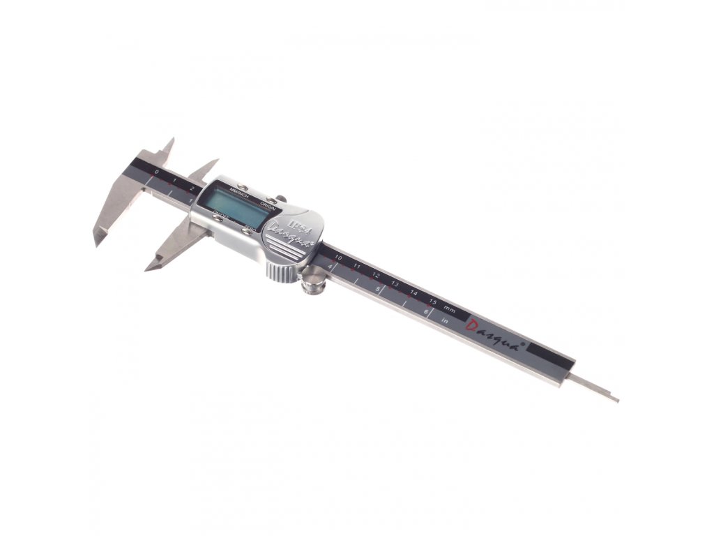 Stabile digitale Schieblehre mit einem Metallgehäuse und großem Display. Messung in mm, inch. Rückstelltaste. Messbereich 0 – 150 mm, Genauigkeit 0,02 mm.