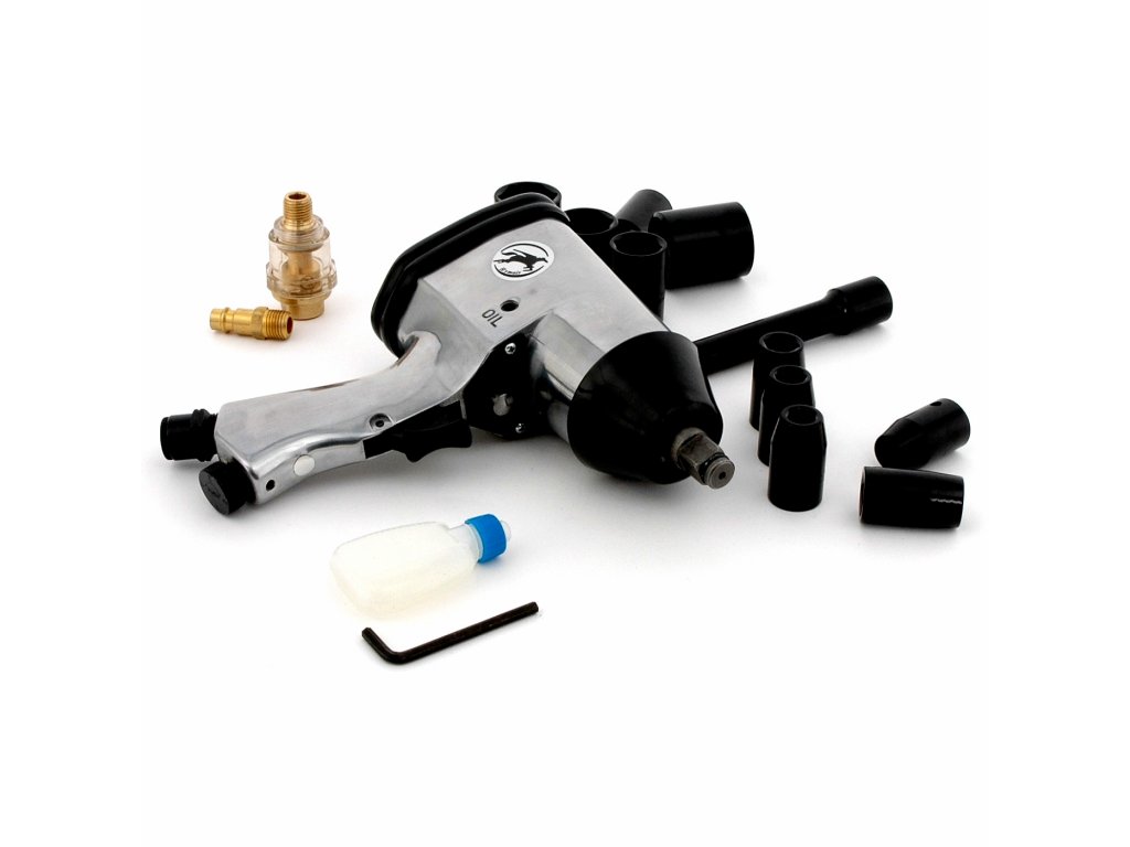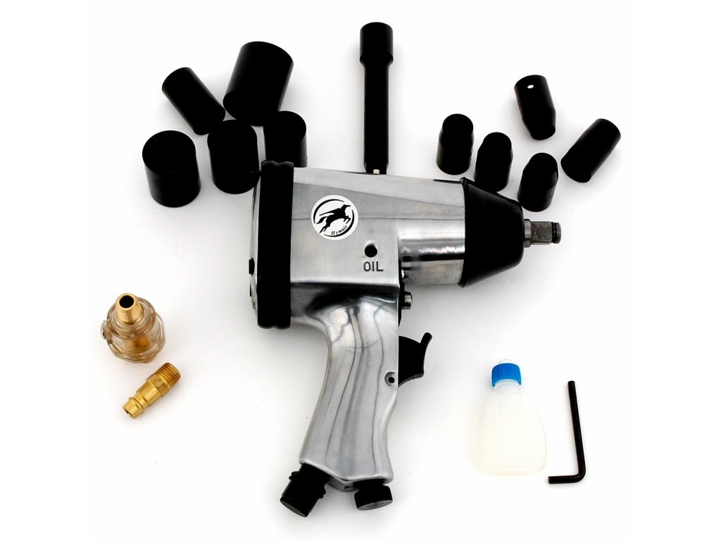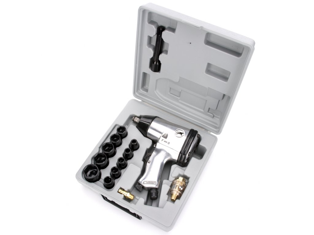 Zum Reifenwechsel usw. geeignet. L/R-Lauf, 4 Drehmomentstufen. In praktischem Koffer. Inhalt: Schlagschrauber, Anschlussnippel, Verlängerungs-Zwischenstück, Nüsse 9, 10, 11, 13, 14, 17, 19, 22, 24 und 27 mm, Koffer. Anschlussgewinde: 1/4" Betriebsdruck: 6 bar Luftverbrauch: 320 – 530 l/min Leerlaufdrehzahl: 8 000 U/min Drehmoment: 310 Nm Antriebsvierkant: 1/2"