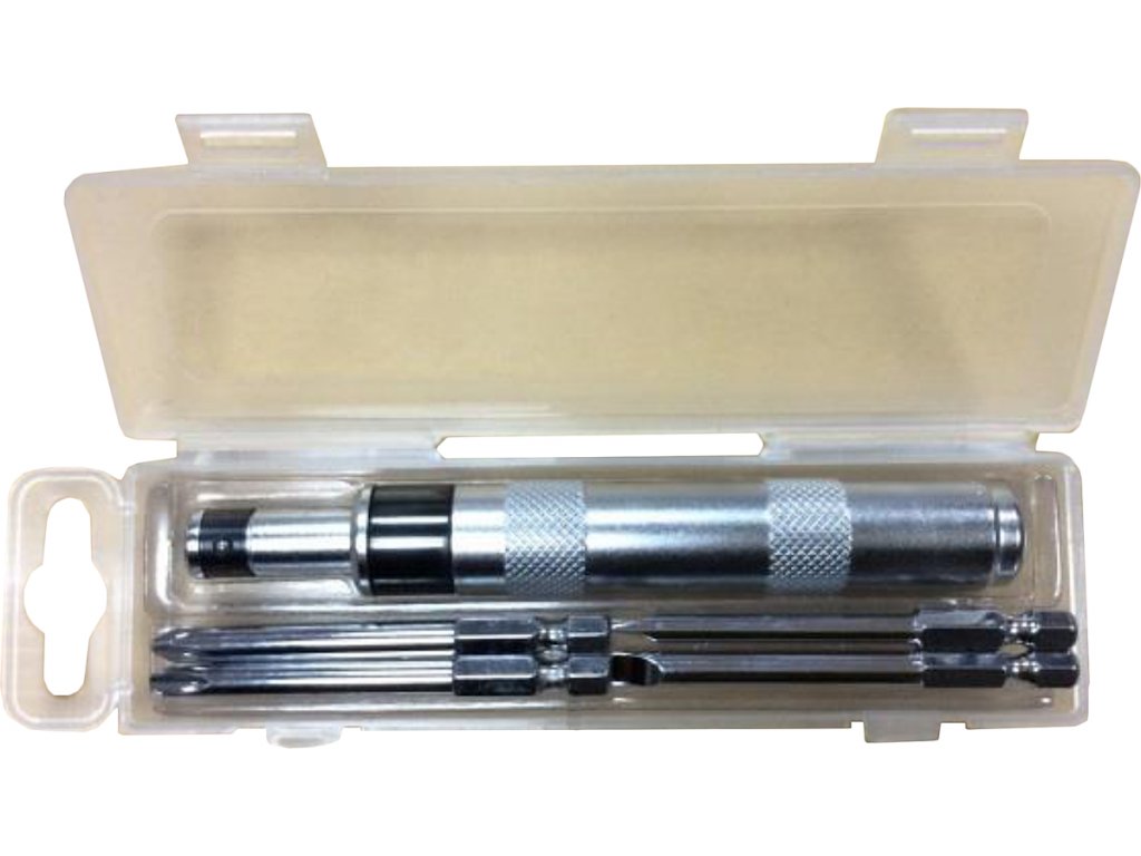 Lieferumfang: 4 × 75 mm Bits: 1/4" Sechskant PH1, PH2, gerade 5 und 6 mm, 1 1/4" Mini-Schlagschrauber. Bitmaterial S2, Griffmaterial S45C.