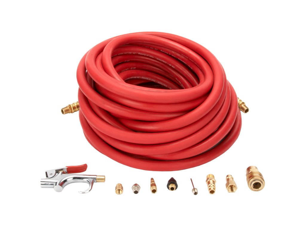 Der Satz beinhaltet 1 × Gummischlauch 3/8″ Länge 15 m, inklusive Endstücke mit Außengewinde 1/4", 1 × Schnellkupplung mit Innengewinde, 2 × Nippel mit Innen- und Außengewinde 1/4", Luftpistole und 5 × verschiedene Adapter zum Aufblasen der verschiedenen Gegenständen von kleinen Bällen bis zu großen Schlauchboten.