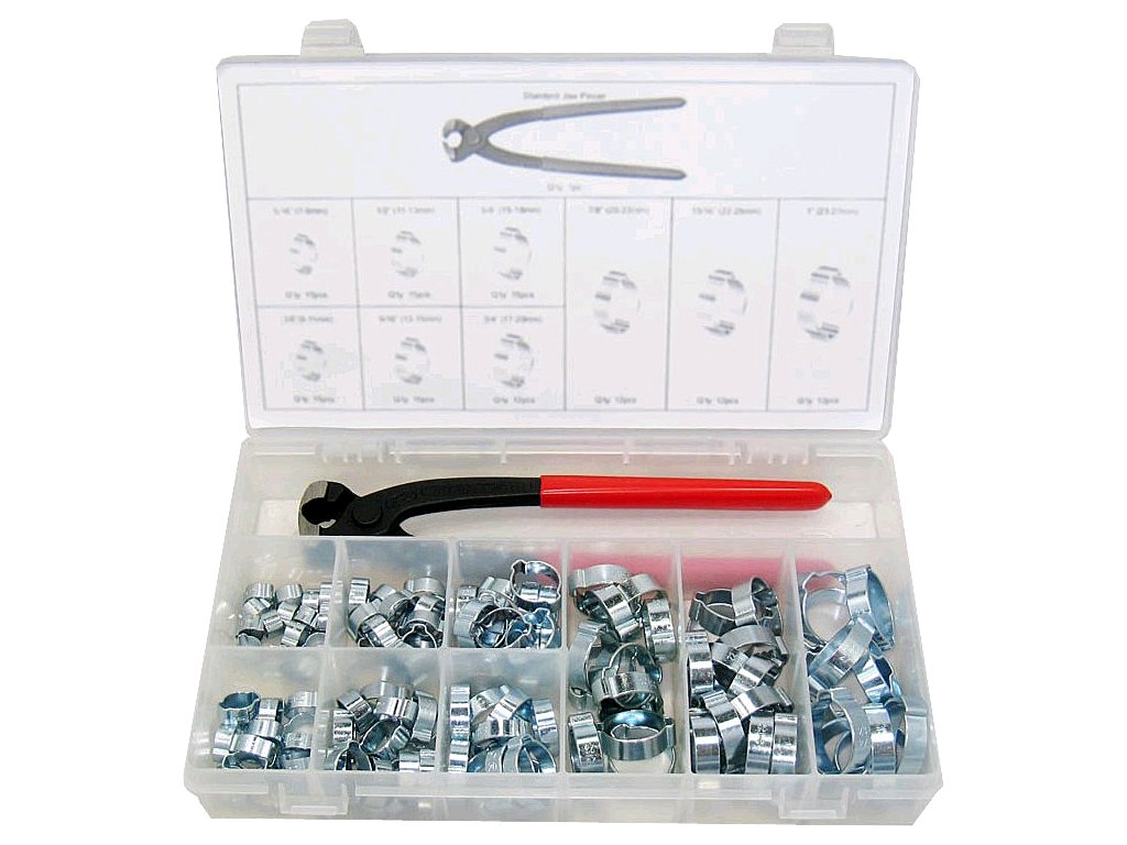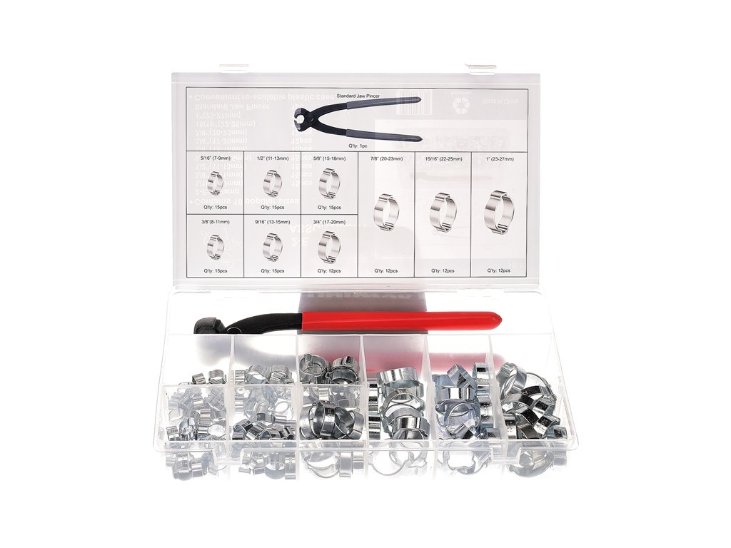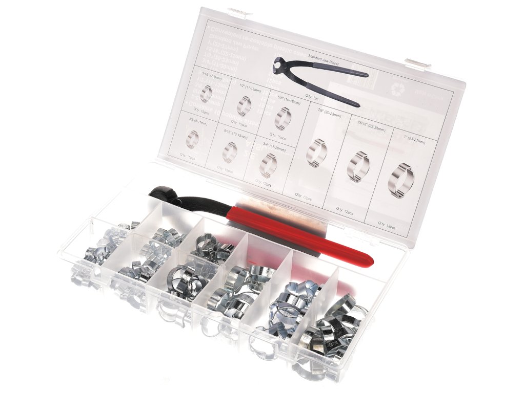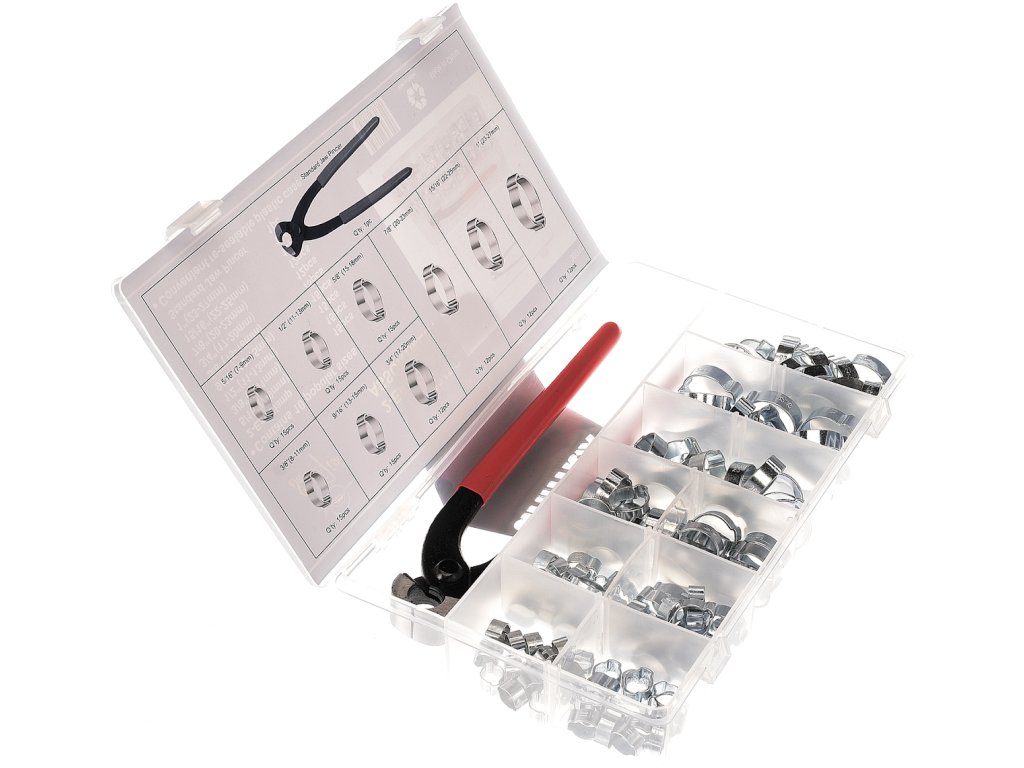 Hervorragend geeignet für Reparaturen von Fahrzeugen, Kühlern, Pumpen u.ä. Im Set enthalten: 15 St. Schellen Ø 7 – 9 mm; 15 St. Ø 8 – 11 mm; 15 St. Ø 11 – 13 mm; 15 St. Ø 13 – 15 mm; 15 St. Ø 15 – 18 mm; 12 St. Ø 17 – 20 mm; 12 St. Ø 20 – 23 mm; 12 St. Ø 22 – 25 mm; 12 St. Ø 23 – 27 mm und eine Schellenzange. In einer Kunststoffbox aufbewahrt.