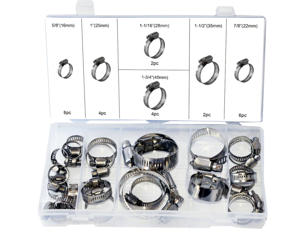 Stahl-Schlauchstellen. Im Set sind folgende Schellen enthalten: Ø 16 mm – 8 St.; Ø 22 mm – 6 St.; Ø 25 mm – 4 St.; Ø 28 mm – 2 St.; Ø 35 mm – 2 St.; Ø 40 mm – 4 St. In einer Kunststoffbox geordnet.