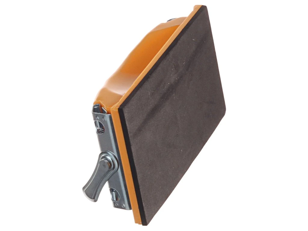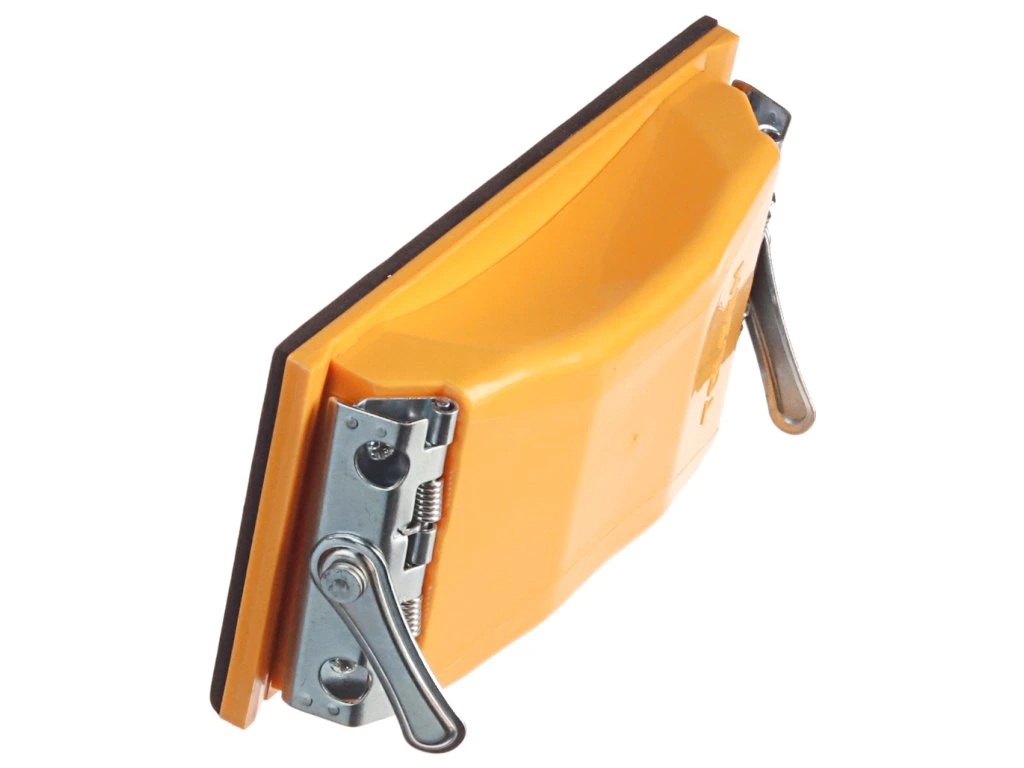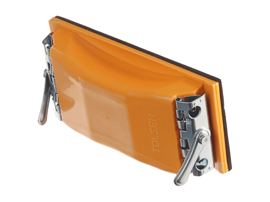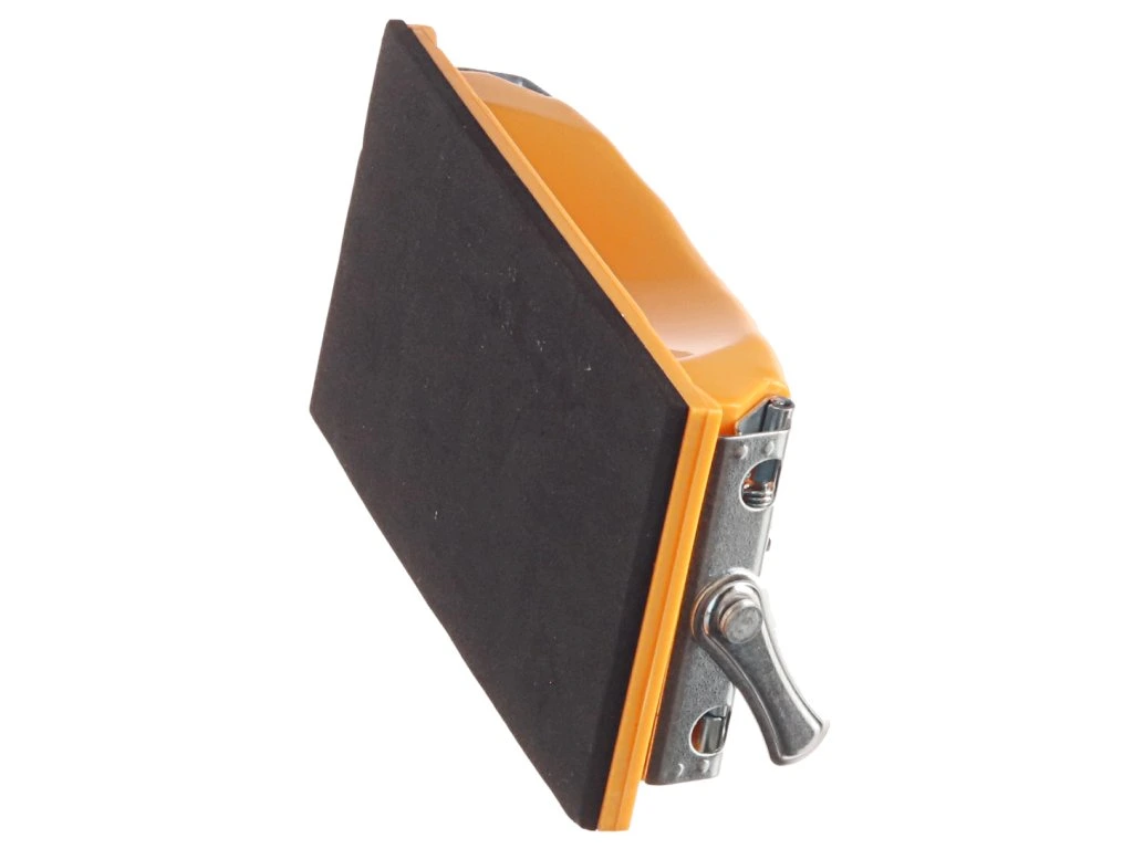 Kunststoffhalter mit Metallklammern zur Befestigung von Schleifpapier oder -leinen. Abmessungen der Basis 165 × 85 mm. Die Arbeitsfläche ist mit einem 4 mm dicken Gummi versehen.