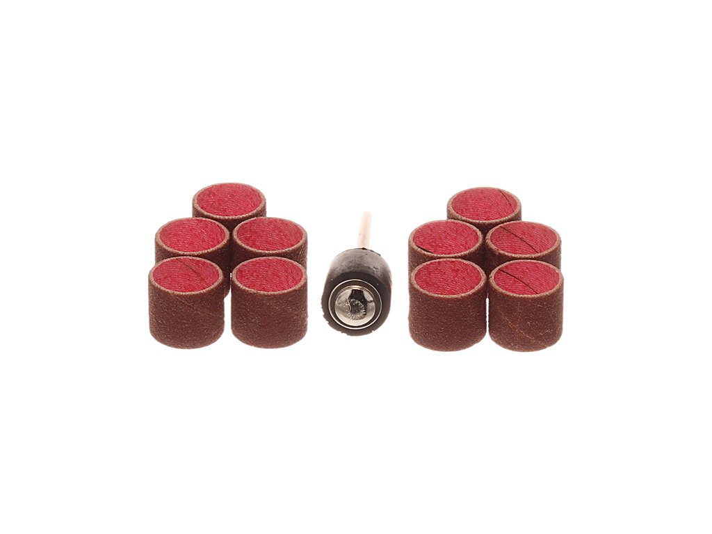 Im Set enthalten sind 10 St. Schleifbüchsen, Durchmesser 12,5 mm, und ein Gummiträger mit Stiel. Besonders geeignet zum Formschleifen von Holz.