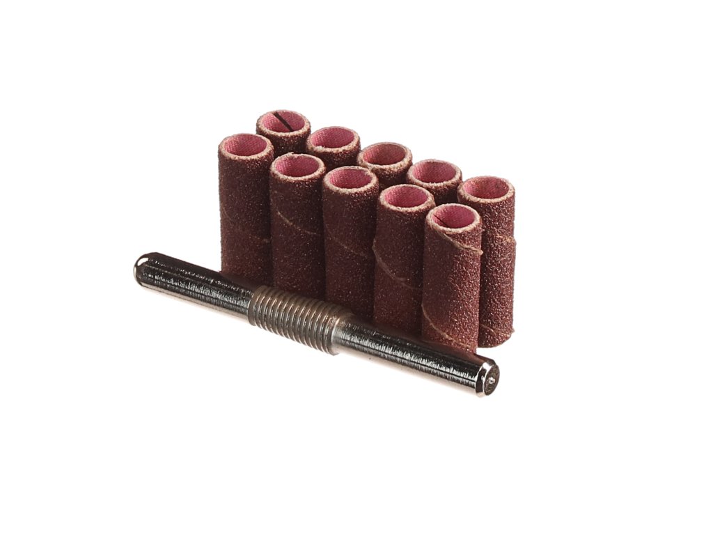 Im Set enthalten sind 10 St. grobkörnige Schleifbüchsen mit einem Durchmesser von 6 mm und ein Träger mit Stiel. Besonders geeignet zum Formschleifen von Holz.