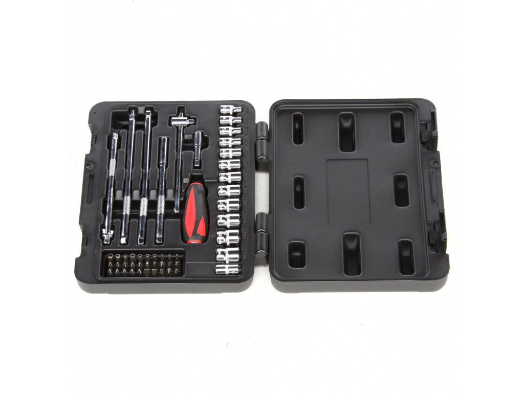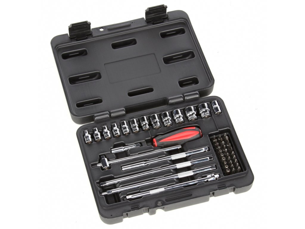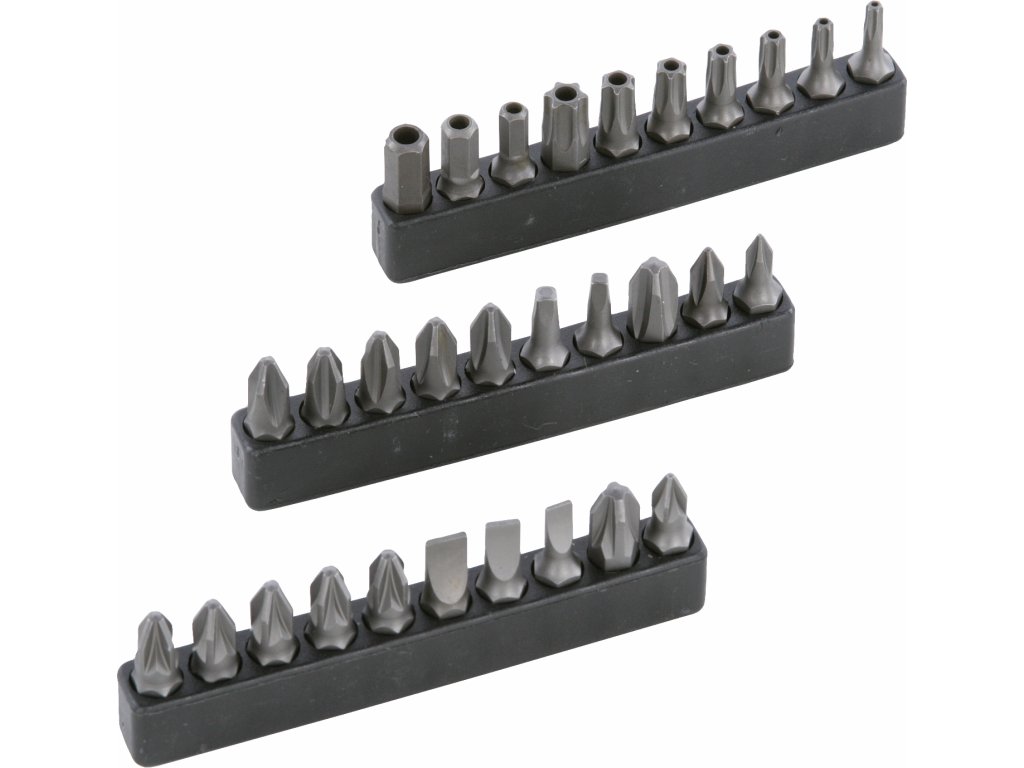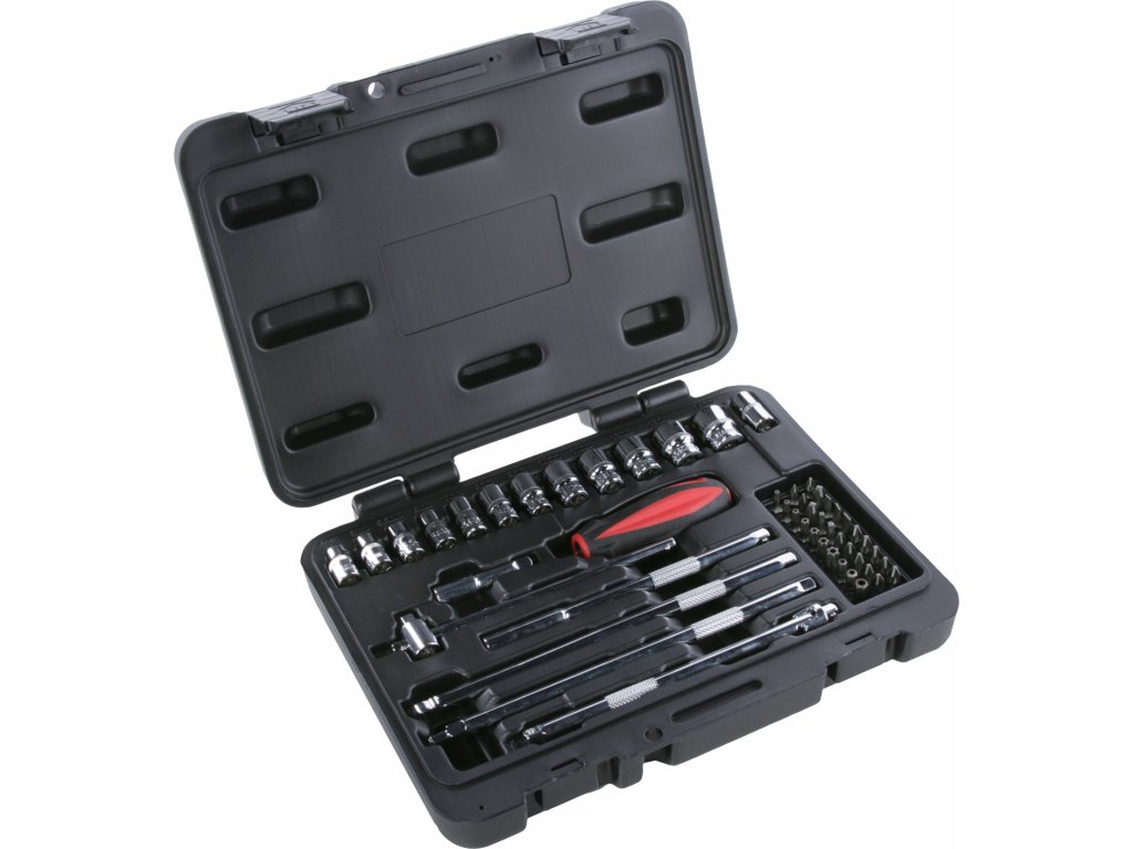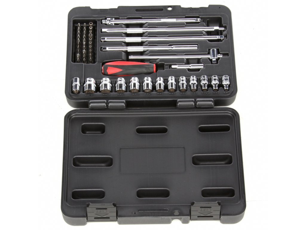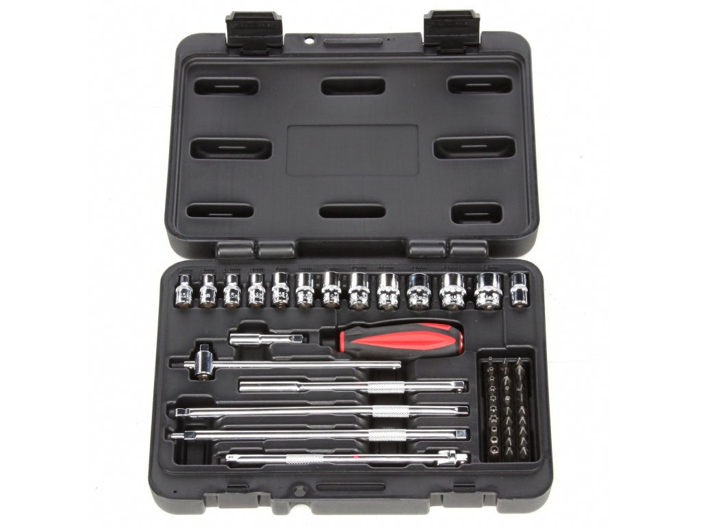 Gola-Vierkant 1/4", 1 × Halter; 7 × Adapter – 1 × ausklappbaren Adapter mit Länge 160 mm, 1 × magnetischen Adapter mit Länge 203 mm, 1 × Knebel, 1 × Verlängerungsaufsatz, 1 × Gelenkaufsatz und 2 × Bithalter Länge 50 mm und 150 mm; 12 × Nuss; 30 × Bits 25 mm. Alles in CrV-Stahl ausgeführt.