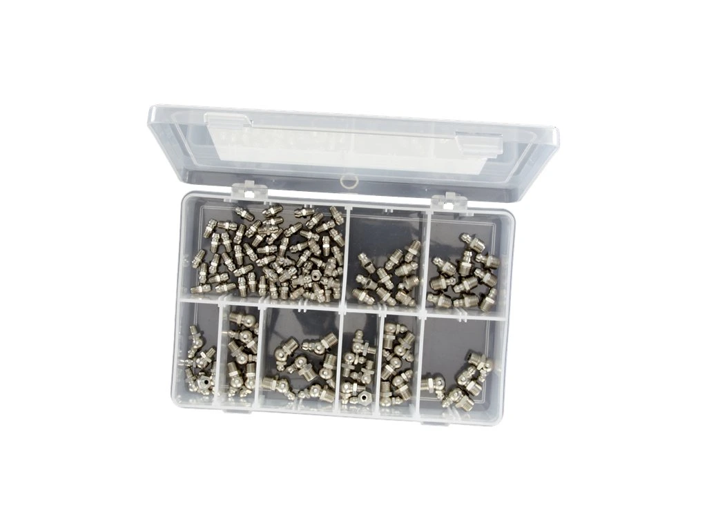 Schmiernippelsatz DIN 71 412 in Kunststoffkassette mit Deckel. Inhalt: gerade, Winkel 45°, Winkel 90° mit Größen M6 × 1, M8 × 8, M10 × 1.