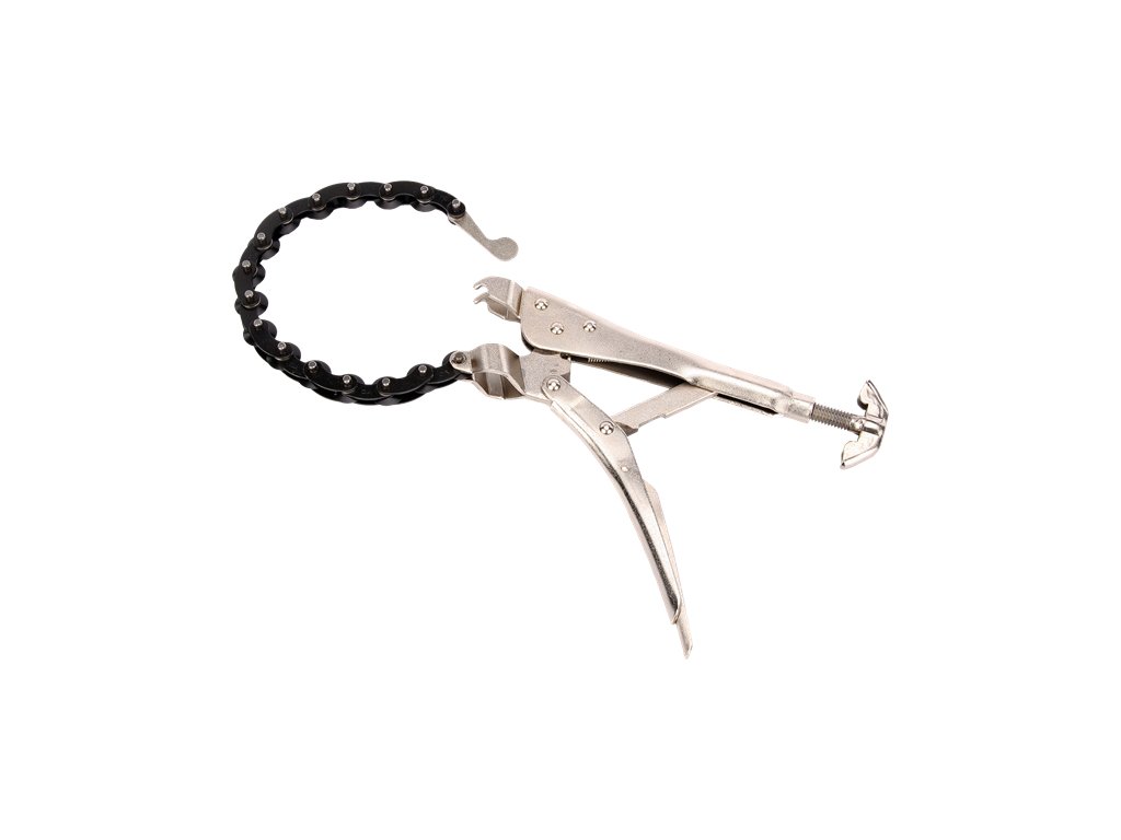 Spezielle Kettenzange zum Schneiden der Rohre, ohne Zugang von beiden Seiten. Selbsthemmend zur Fixierung in der Schnittstellung und mit 15 Stück gehärteten Scheidrädern ausgerüstet. Gerade durch die größere Anzahl der Räder wird der Schnitt durch pendelnde Bewegungen realisiert. Dadurch werden sie zum Kürzen der bereits in der Montagestelle ausgerichteten Rohre bestimmt. Kapazität der Rohrdurchmesser 19 – 83 mm.